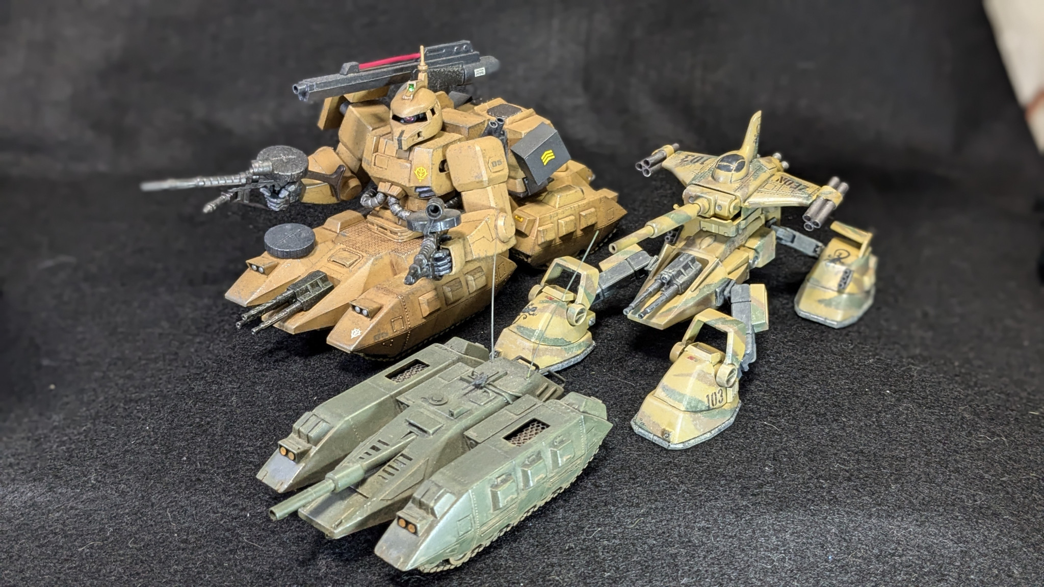 マゼラ・アタック、水中用ザク、高機動型ザク(JR)、GMスナイパー、GMキャノン、GM(HG)、ザンジバル、FAガンダム、ザクタンク、AEG1、ZZ(旧1/100)、GMカーディガンのパーツで出来てます。