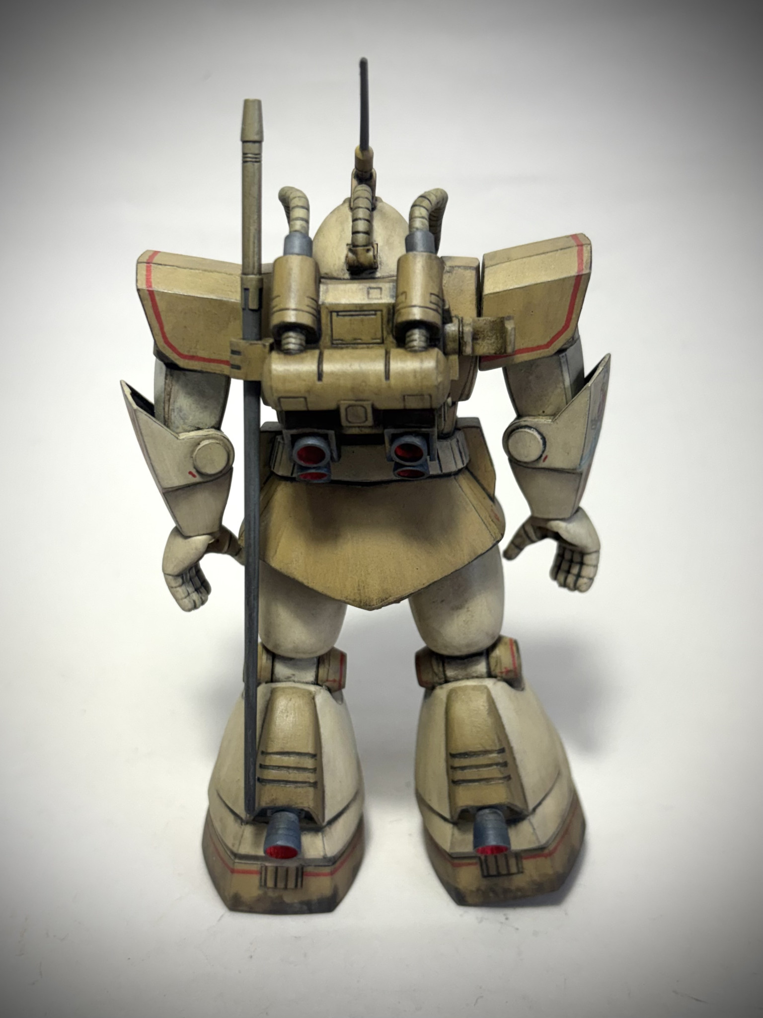 後ろはこんな感じ。あまり塗り分けを増やさずサンドカラーにまとめております。無改造のつもりでしたが、動力パイプの接続部は気に入らなかったのでコトブキヤのパーツで盛っています。