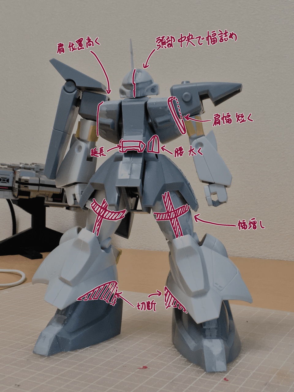 元のキットのプロポーションも味わい深いのですが、設定画に近づくように改造。
