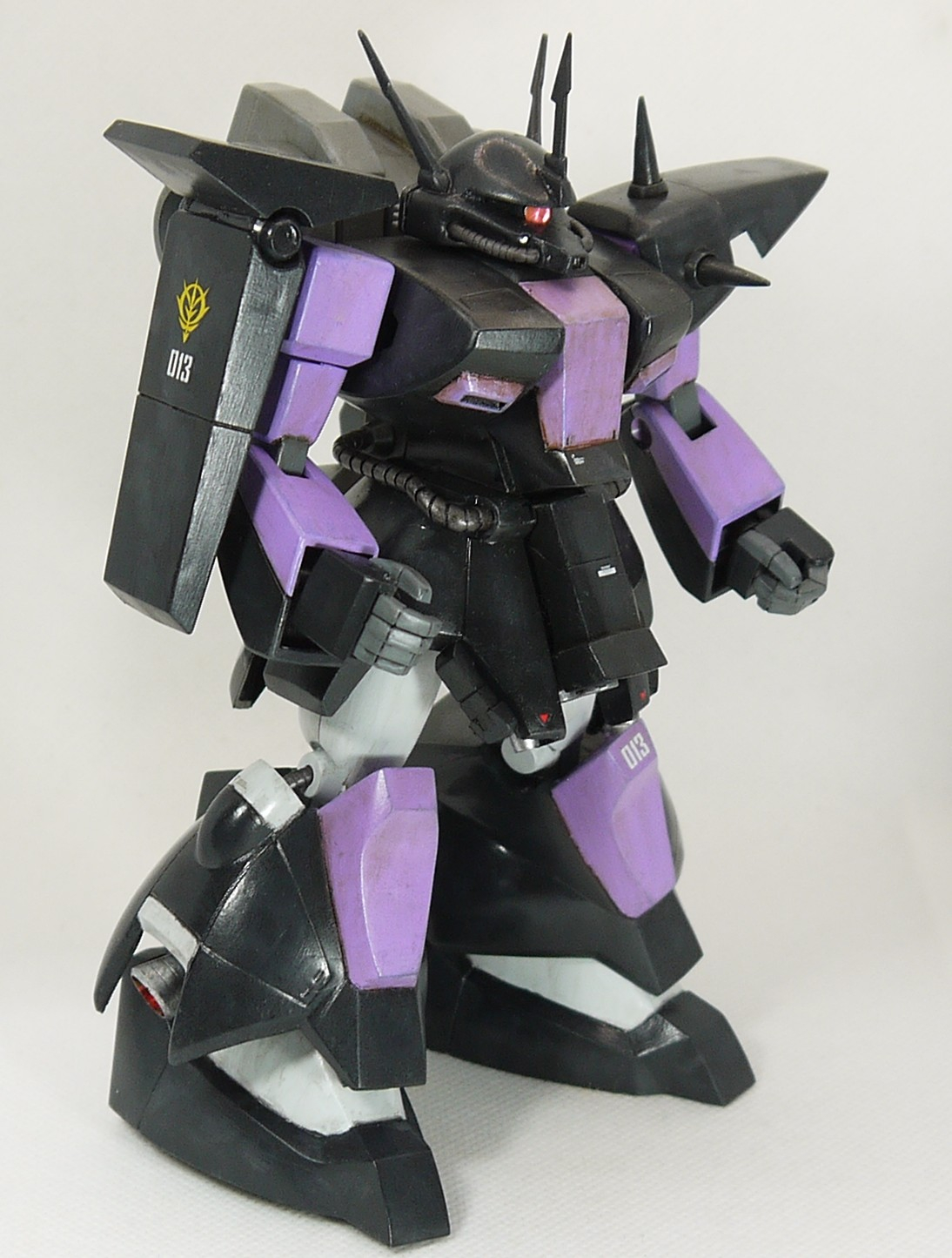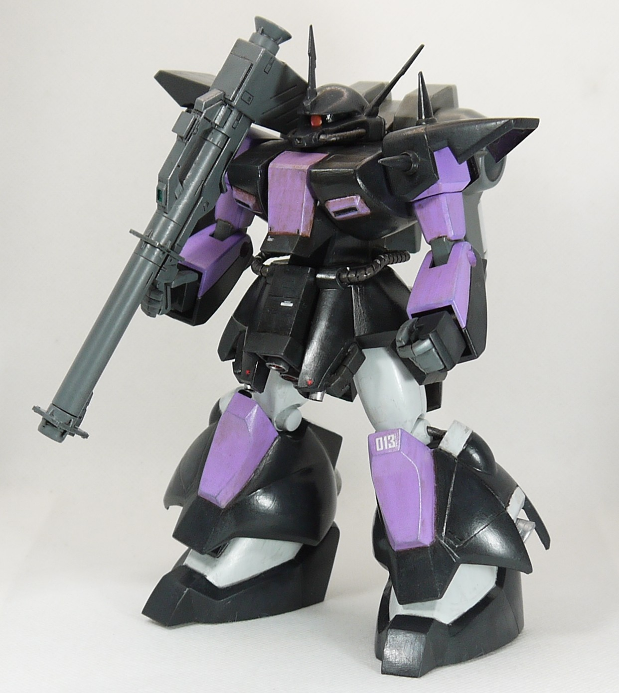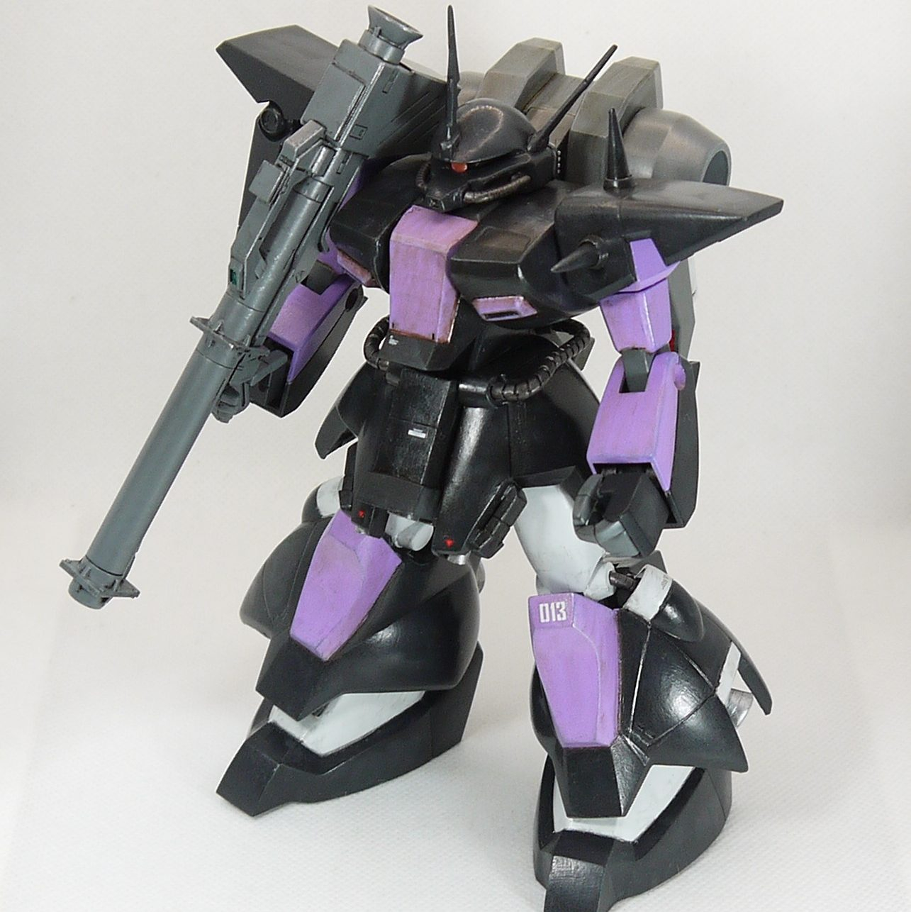 塗装はザクの意匠にドムっぽいプロポーションなので、黒い三連星カラーにしました。また、黒い三連星と言えばバズーカのイメージなので、以前作らなかったνガンダムのバズーカに少し手を入れて持たせています。