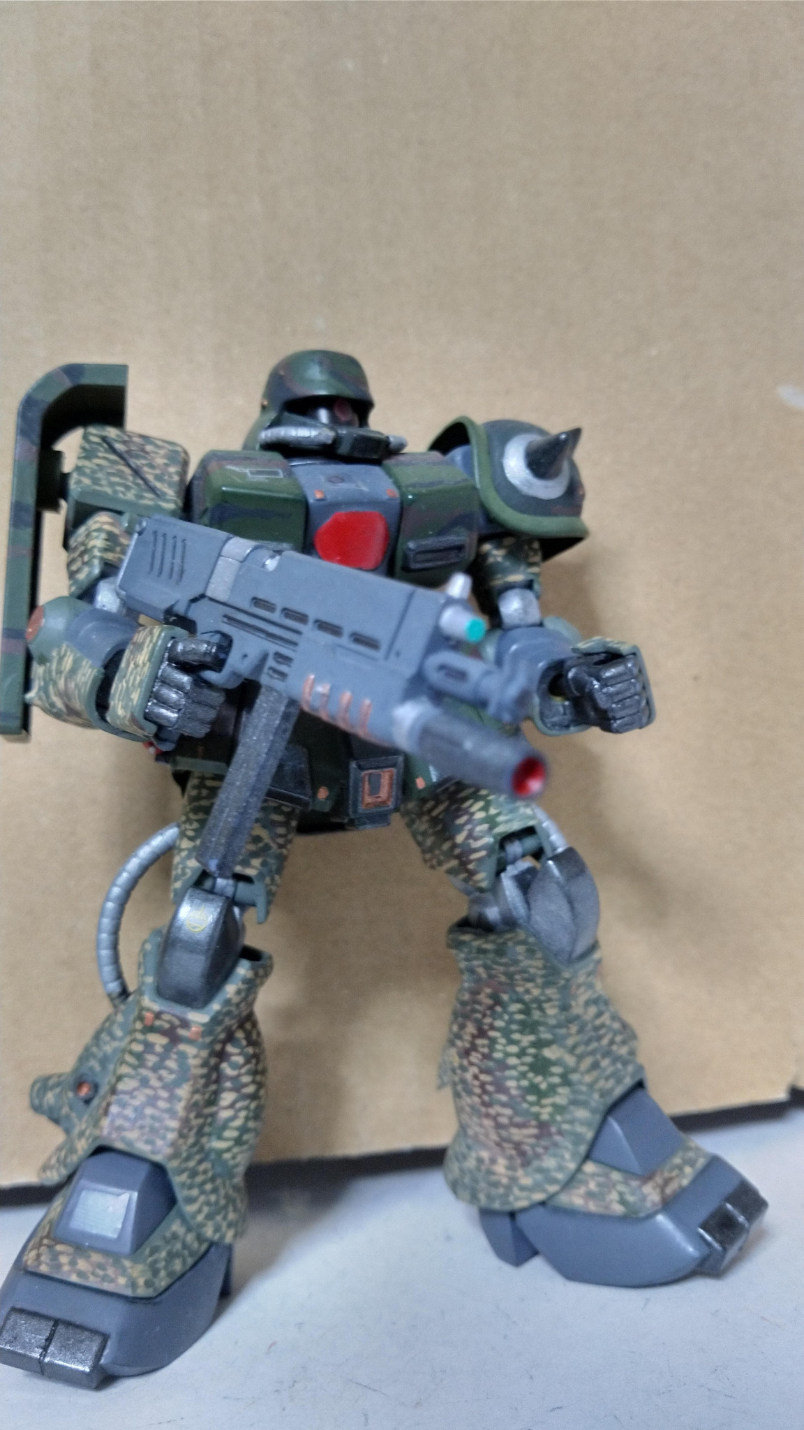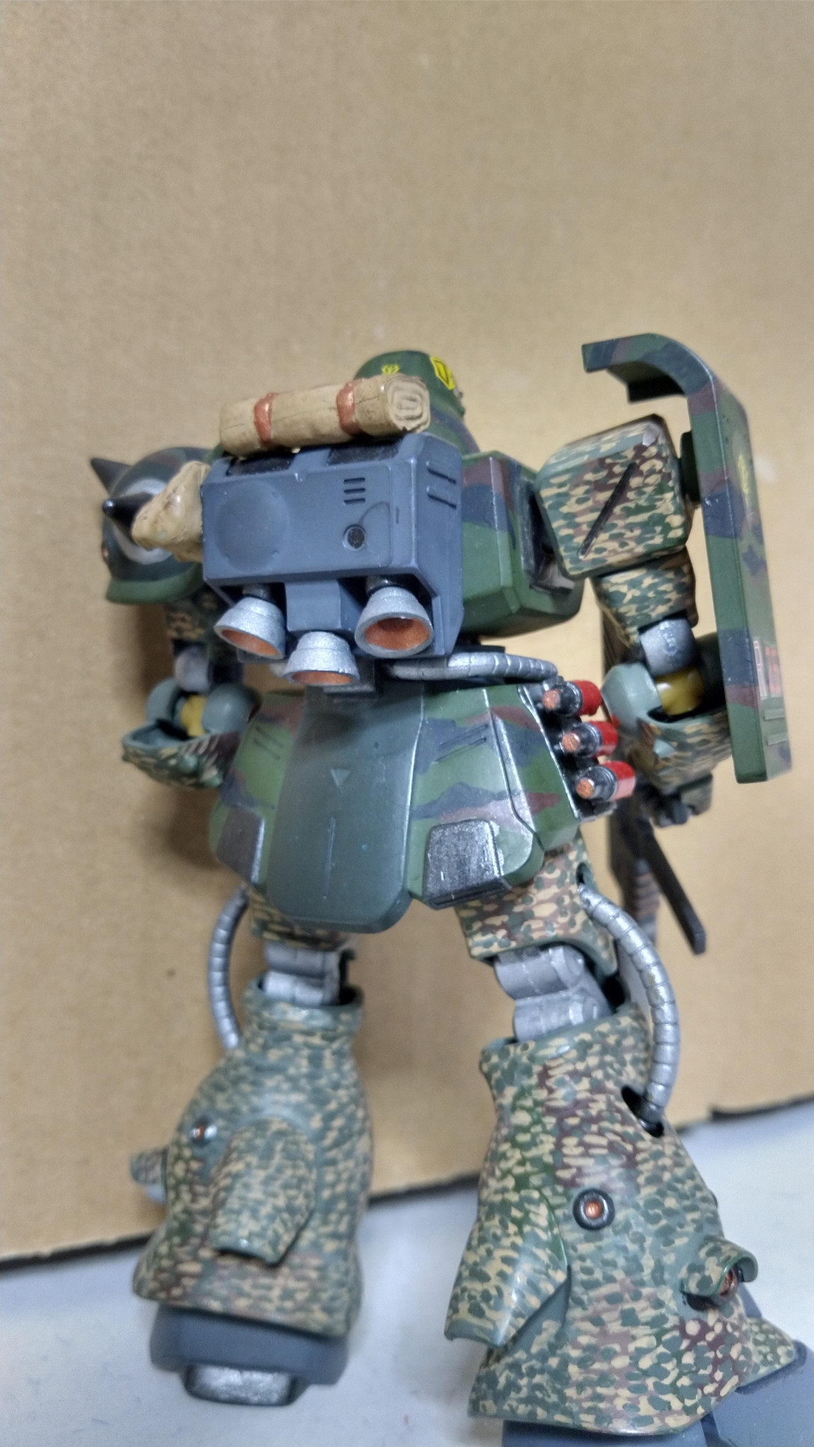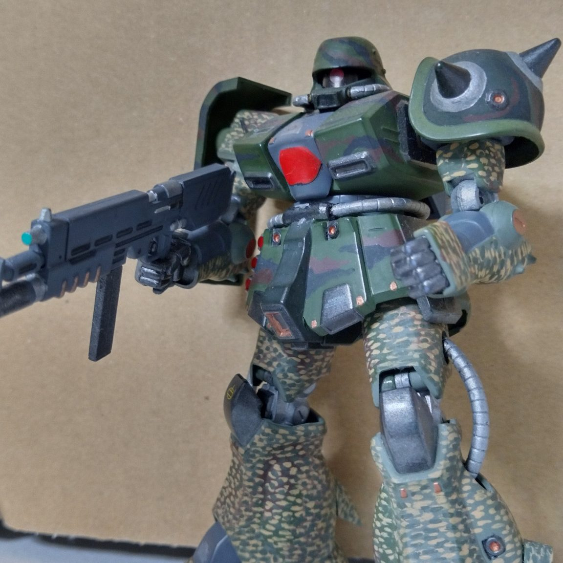 20年以上前に作った過去作です。(*^^*)OVA発売時に購入したキットをほぼ無改造(脚関節のみ延長)で製作。筆塗りで迷彩塗装しました。胴体は旧西ドイツ戦車風。手足は国防軍兵士カモフラ風に。当時は百均の筆を使用していたので、イマイチな仕上がりです。