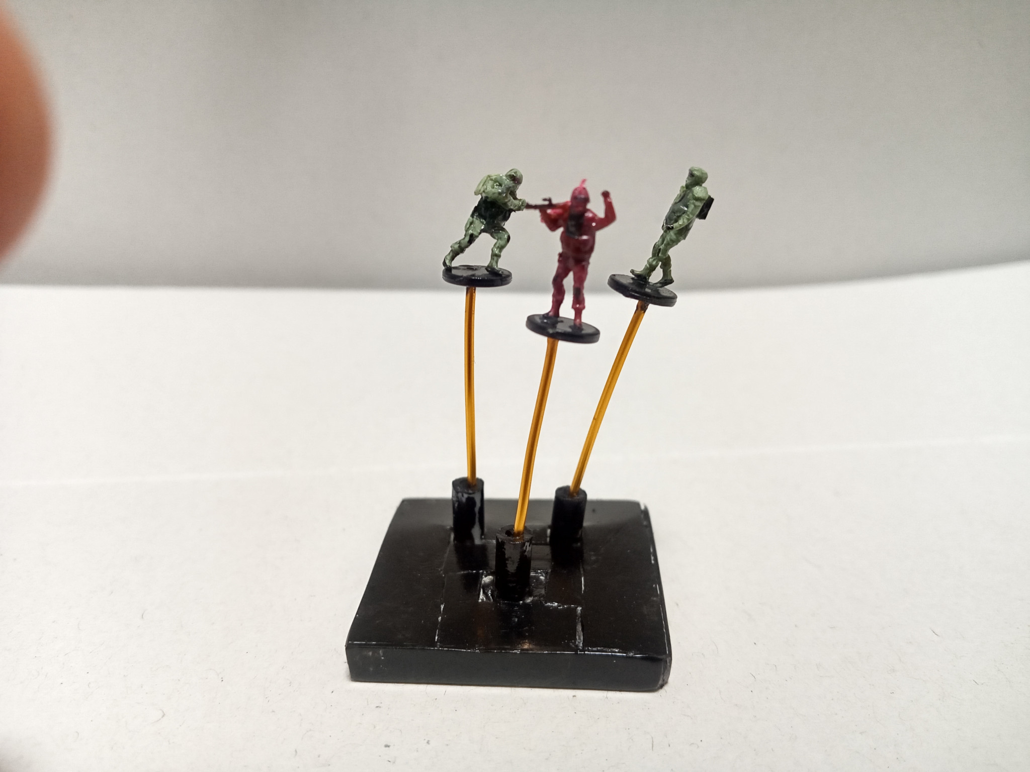おまけのザク小隊です。100均のミニチュア軍人セットをそれっぽく弄って色を塗ってみました。ザンジバルの添え物として作ったので遠目でそれっぽく見えればの精神です。