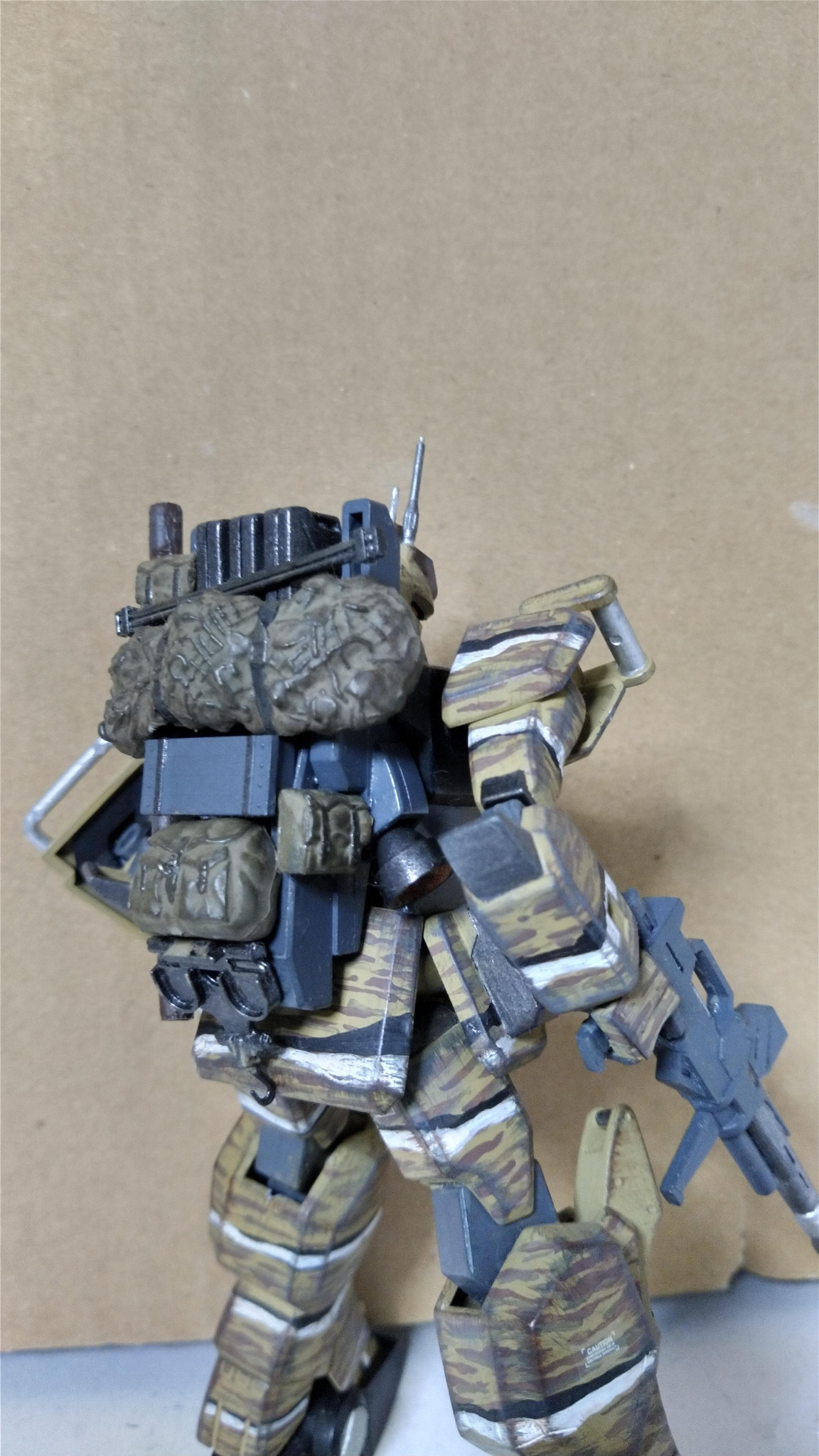 OVA発売時に当時の旧HGキットを購入。筆塗りで製作しました。迷彩は東南アジアなどで、現地兵が着るカモフラ仕様を意識しました。