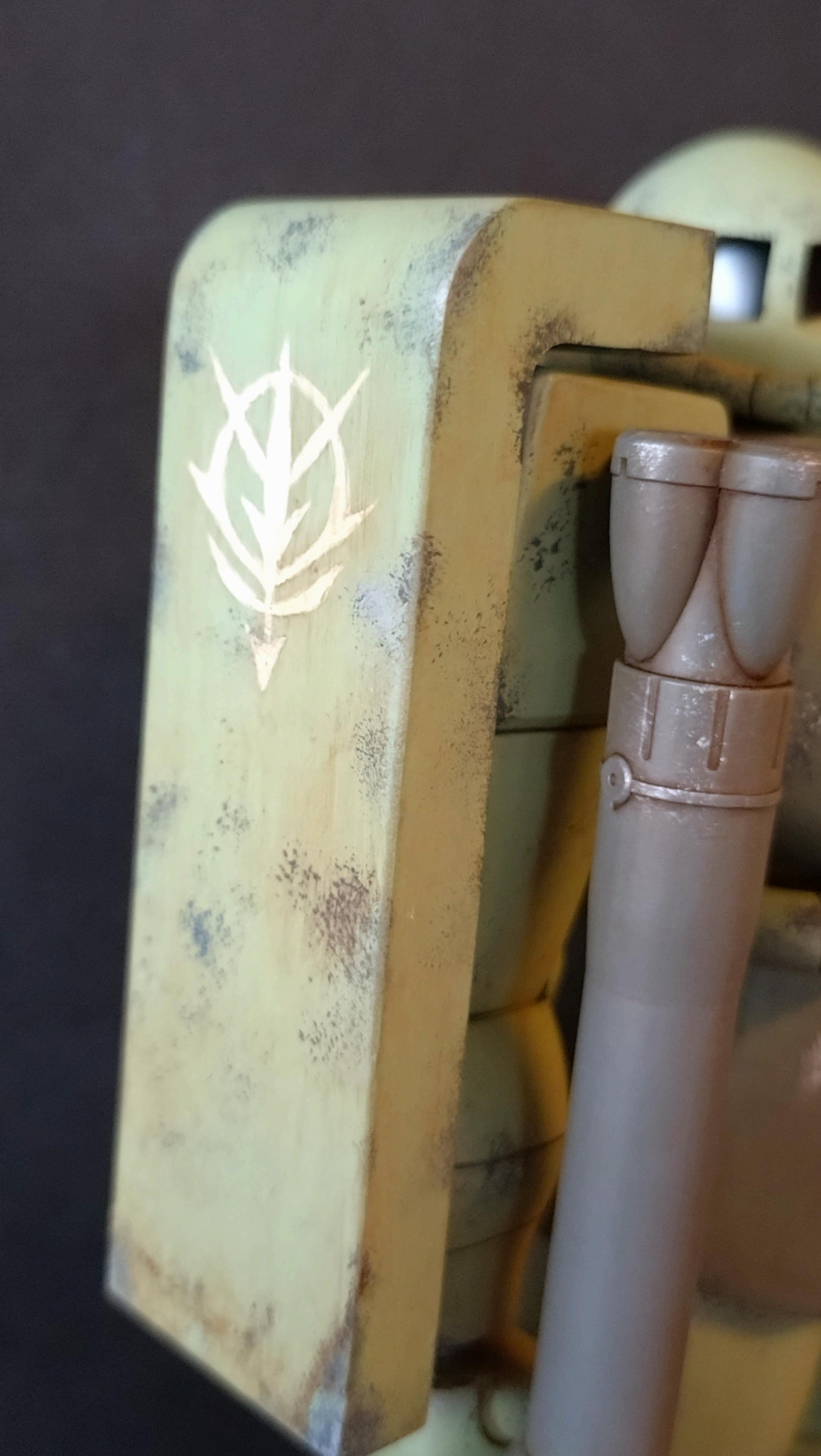 右肩シールドはキット2つを貼り合わせ厚み増しと幅増しをしました。ジオン公国章は良いサイズのものがなかったので手書きを頑張りました。