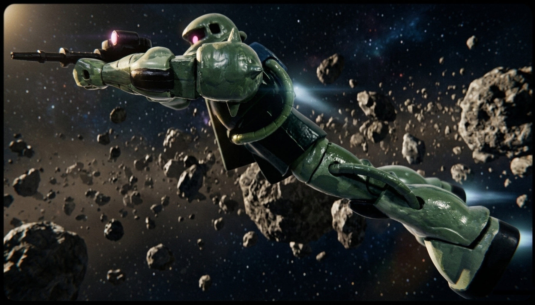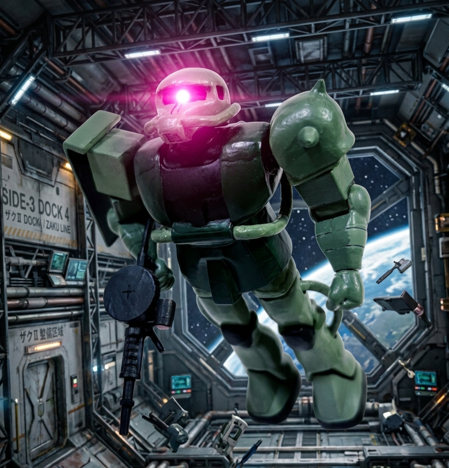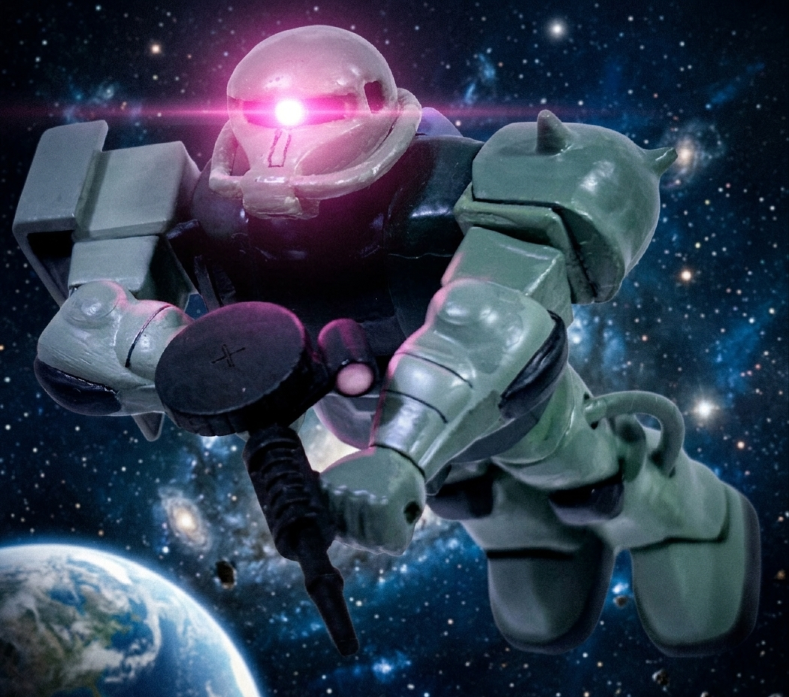 最近なかなかガンプラを買う暇がなく、忙しい日々を過ごしているので気分転換に以前作ったザクのメンテナンスと久々のデジラマ加工も兼ねて宇宙におけるザクの活躍を撮ってみた。