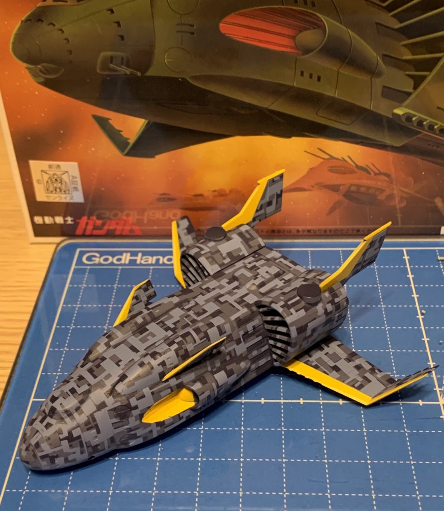 前半分だけを見ていると、ラピュタのゴリアテに似てるような気がしてきました。あちらはサンド風の迷彩ですけど。ゴリアテの舳先ってカットによっては薄い黄色にも見えたのが印象にあったかも。