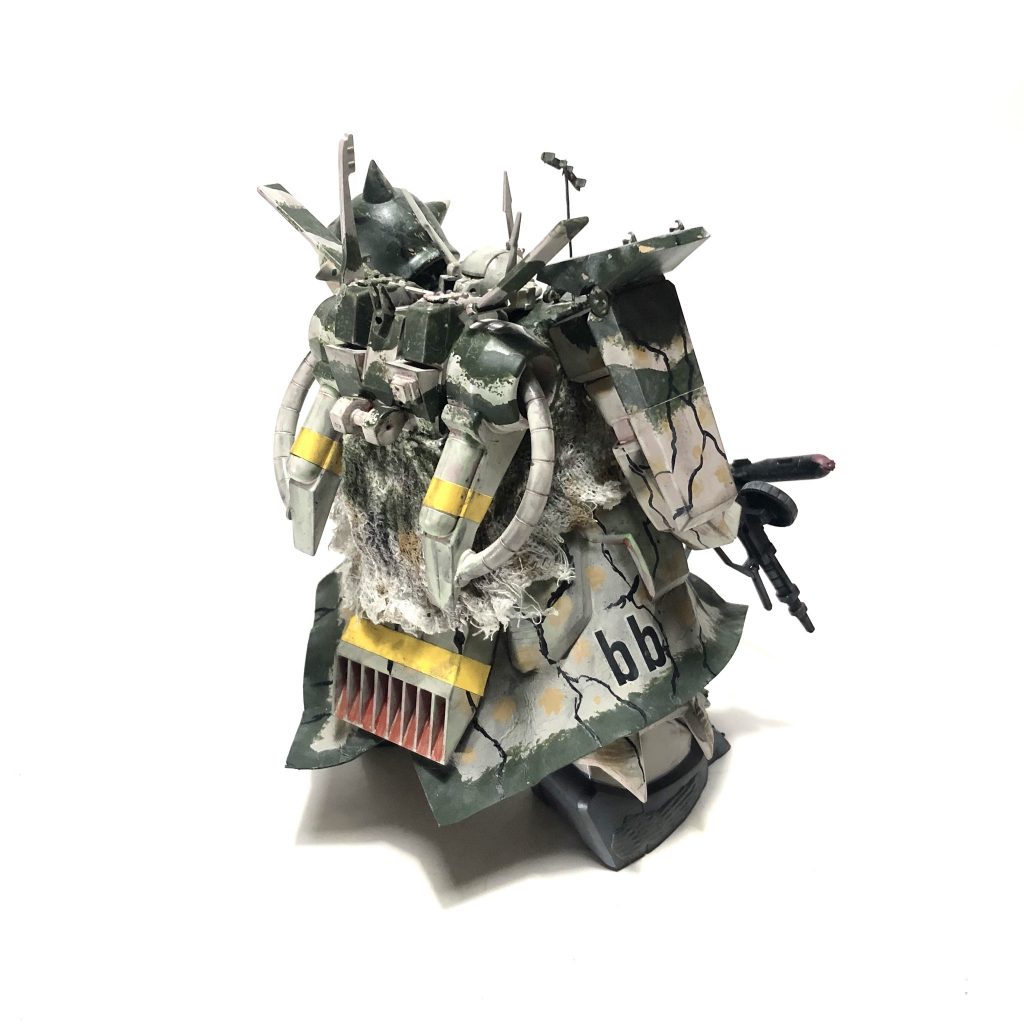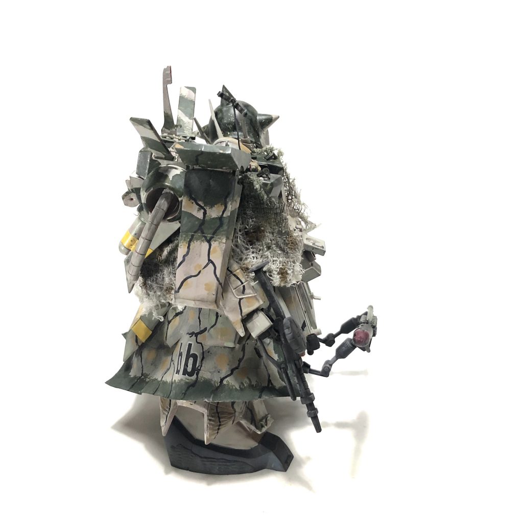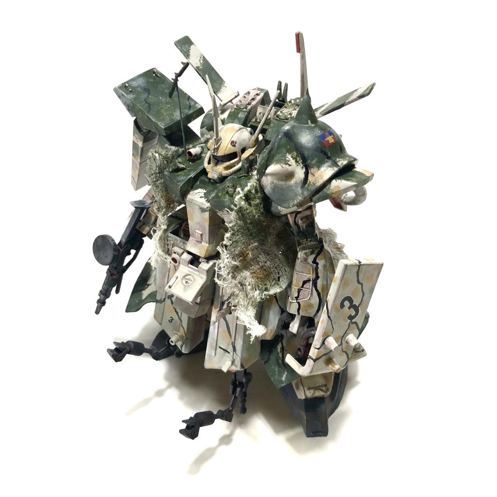 雪山森林地帯を想定したカモフラージュ。トレンチコートは歩行時の泥の巻き込み防止のための物。(トレンチコートはガンプラ下箱のボール紙を濡らして曲げて作った事は内緒だ!)
