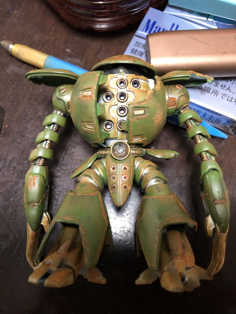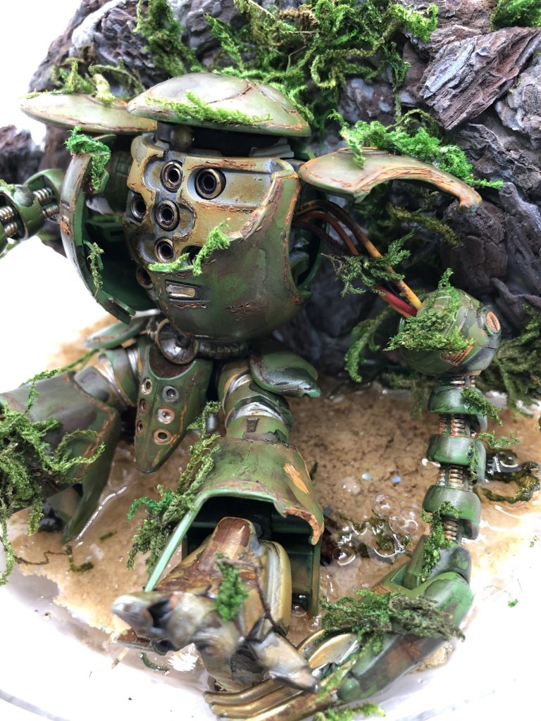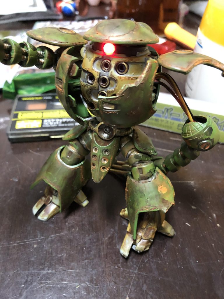 一見設定通りの朽ち果て待ちみたいな感じにも見えたのですが、モノアイの光が消えていないところから、擬態して人を驚かそうとしている太った河童みたいな妖怪、的雰囲気にも見えてきました。