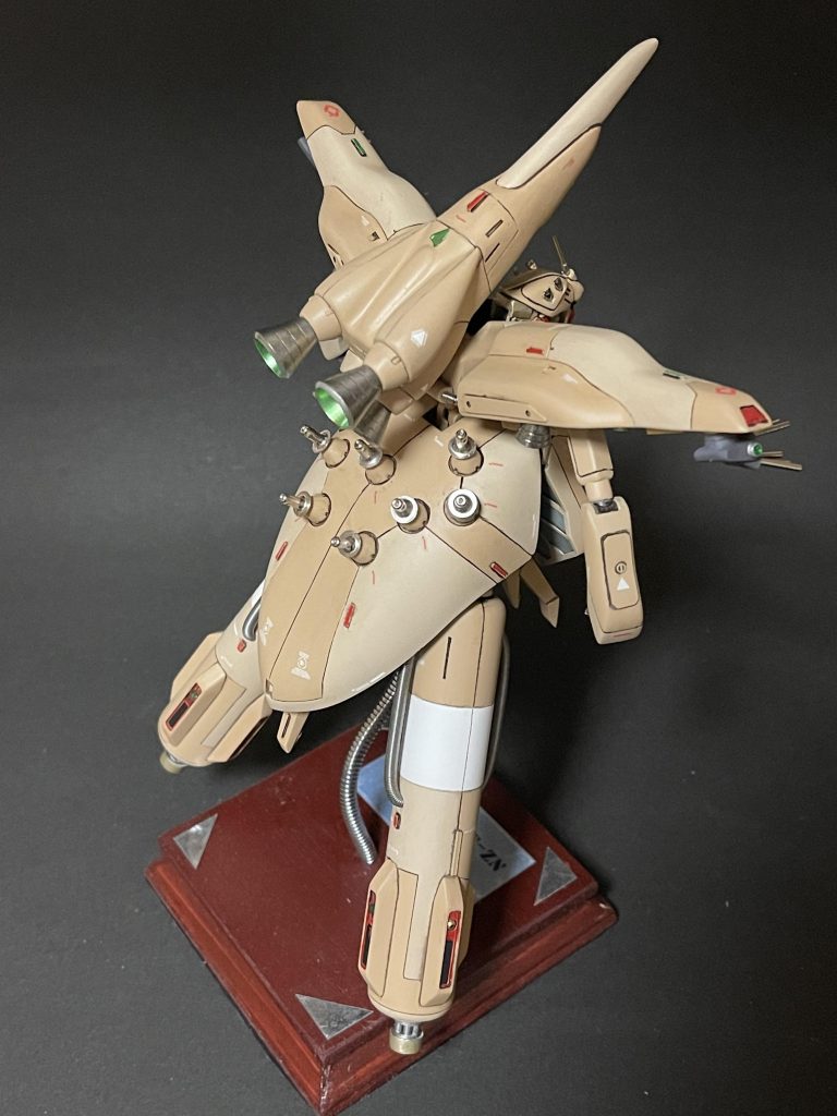 バーニアは上部4機の内下の2機(小さい方)は金属のタナダボで表現する予定でしたが重量の関係上NGとしました。タンク先端のバーニアはバルカンパーツの組み合わせでなんちゃって感丸出しと言う悪い癖?wをそのままにしてます。ファンネルに関しては研ぐと危ないのでメタルスタッズの凸パーツを強引に被せて形状アピールしてみました。