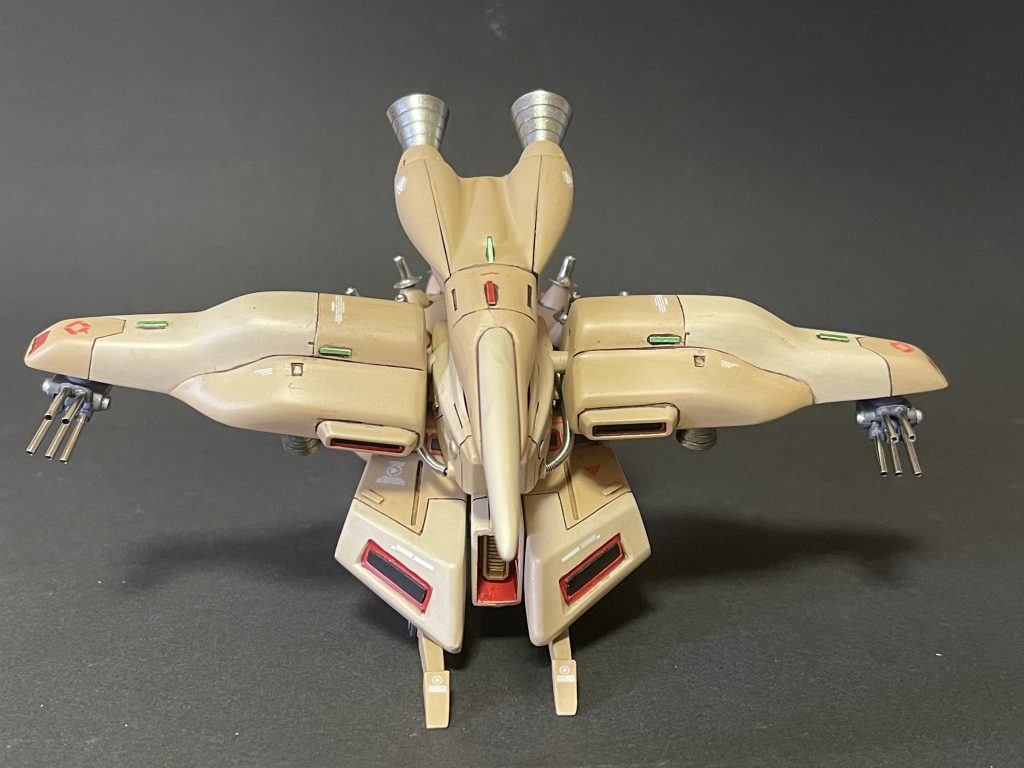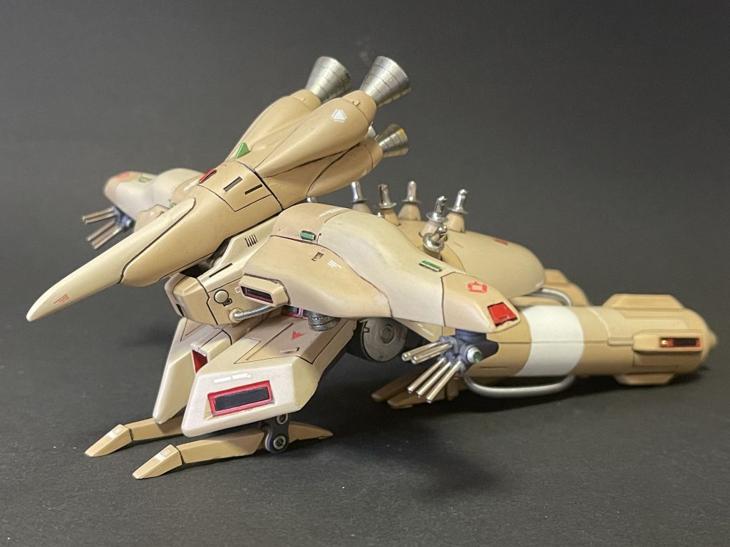 当初、タンク接続部にBJを仕込む予定でしたがタンク部を長く見せたかったのでタンクその物を延長せずHGUCジェスタの股関節パーツを連結させる事でタンクの左右への可動範囲確保とタンク全体が長く見える様にしてみました。アーマーやスカートの裏はそれなりに頑張っては見たもののイメージとは程遠い物になってしまいました。