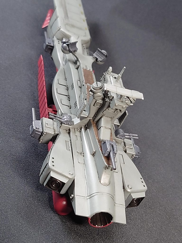 ありがとうございます♪ 今回は日本海軍艦船や自衛隊護衛艦などを参考にしてます。カラーも海軍からです。グレーは軍艦色2をそのまま使用してますね。艦底色がなかったのでこちらはシャアレッドです。単装砲はティターンズブルー1だったりします。実はレストア前には、皆さんのサラミスも拝見させてもらってます。艦船やサブメカも楽しいですよね!