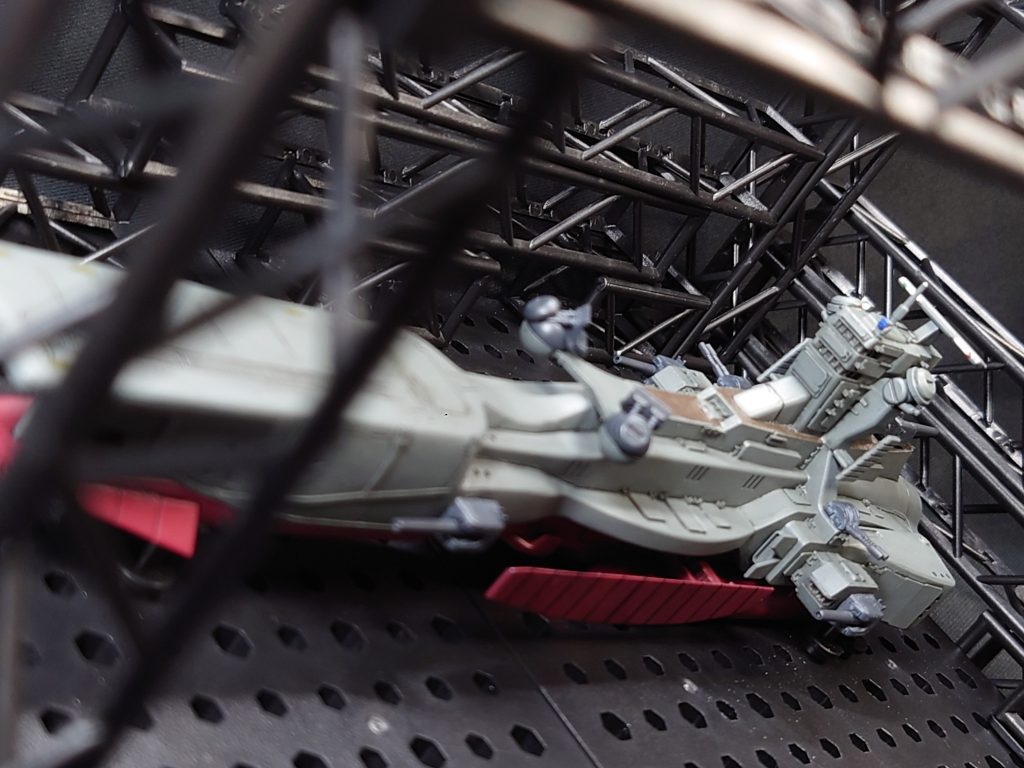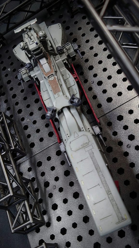 艦底はさらに特徴的である。連絡艇(本来は大気圏突入艇)の搭載位置を変更して、MS格納庫の空間を拡張している。長時間稼働のための大型増槽が取り付けられているが、この増槽も強化外殻の実験で継ぎ目がほぼない。放熱板は艦体から離れた位置に変更されて、一応艦体増槽の保護の役割もある。3機のスラスターは高重力下航行を想定しているが、実際には高機動用として使用されている。スペック上ロングランは、重力圏内からブースター無しでも大気圏離脱が可能だが、活動圏内に地球は含まれてはいないので、試す機会がない。
