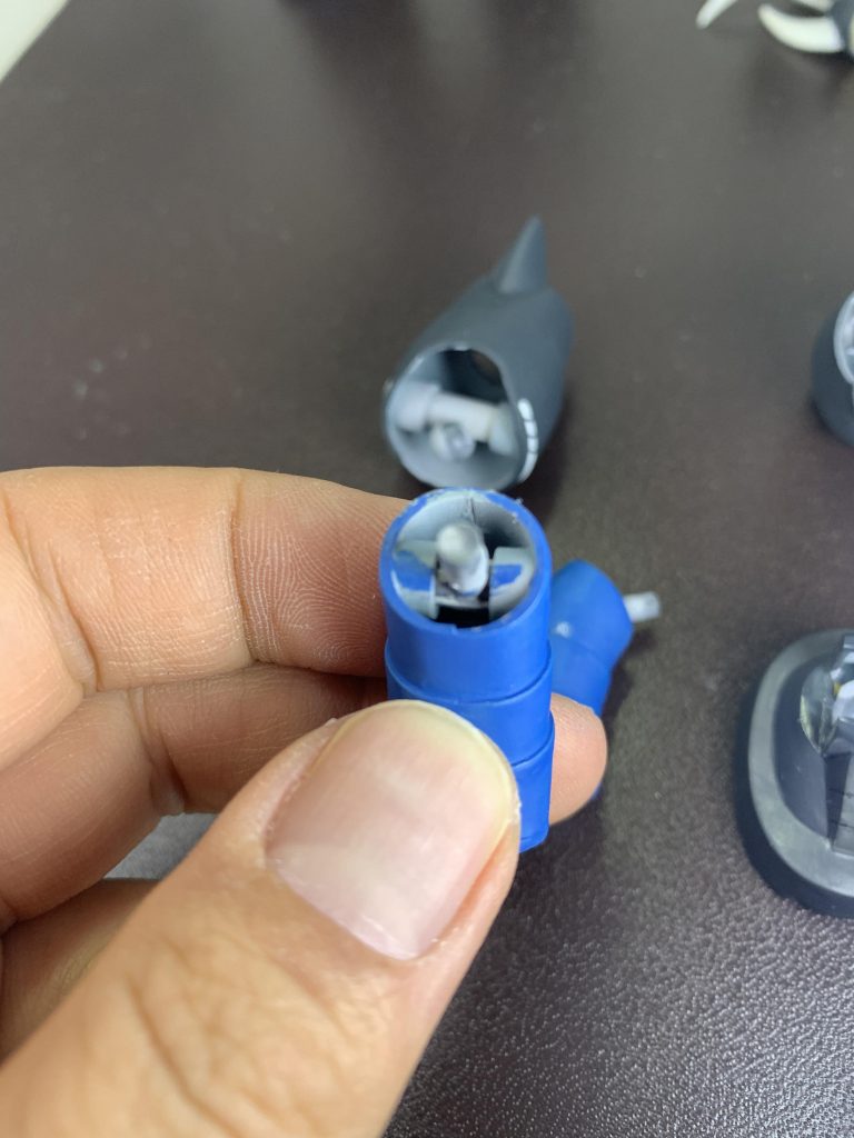 同じ1/144スケールのはずだけど、RGの方が大きいです。旧キットの塗装はアクリジョンの手塗りです。エアブラシ塗装もできたけど、あえて筆塗りにチャレンジ。エアブラシを使った方が時間的には早かったかも。カラーはRGに寄せつつ、テキトーに。手足のブルー部分をもう少し暗くすべきだったかなあと思ったり。