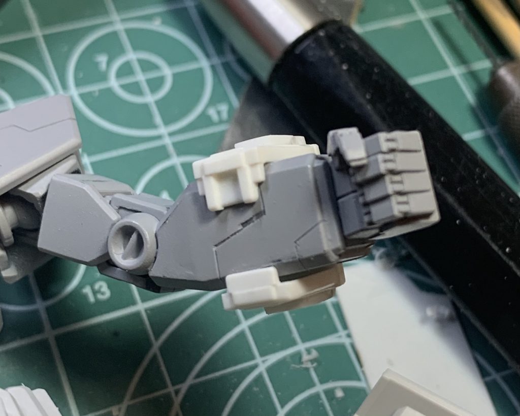 新造のシールド受け部、ハンドパーツは、市販の3Dプリント品にしています「ロボマニM」だったかな、