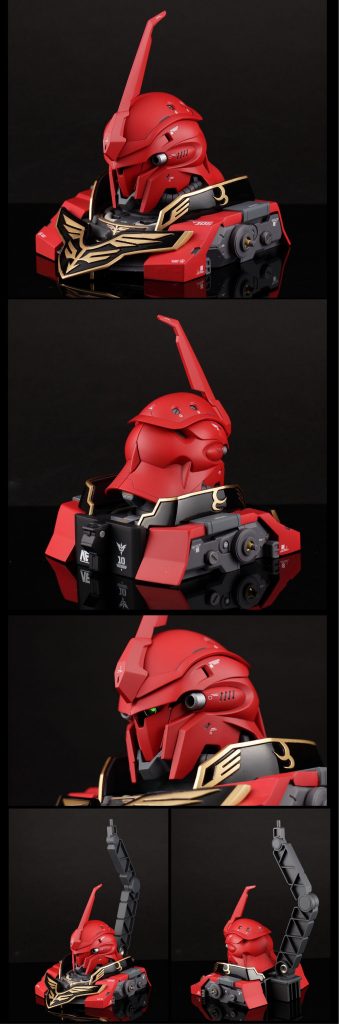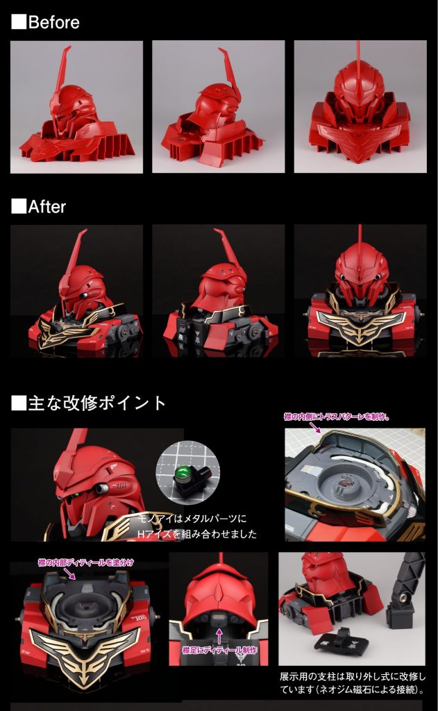 月間ガンダムエース2011年1月号付録 シナンジュ ヘッドディスプレイベースを制作しました。 ジャンクパーツでメカディティール追加してます。バルカン横にスリットスジボリ、モノアイは金属&Hアイズに変更。支柱は取り外し式に改修しています。