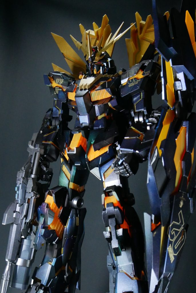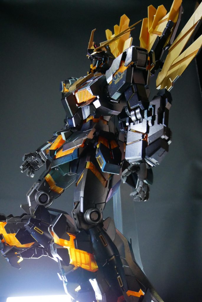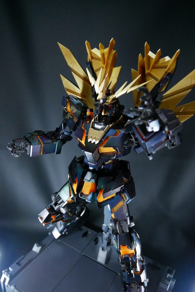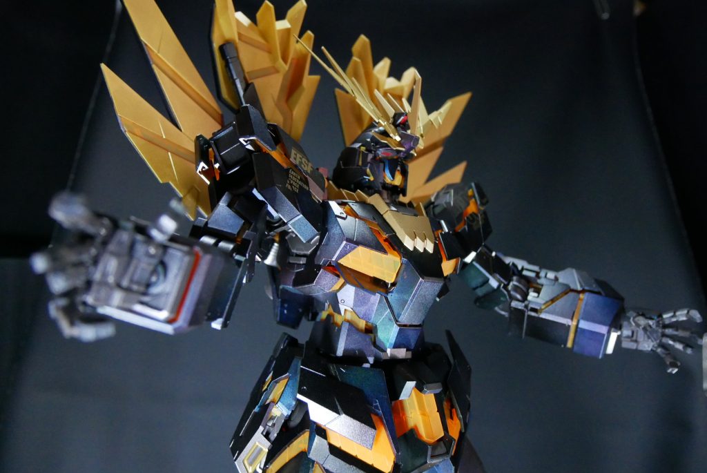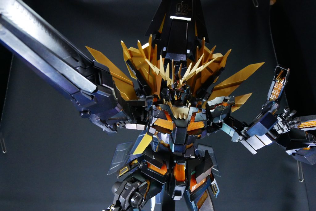PGということもあり、撮影ブースの用意から大変苦労しました。アームドアーマーBS、VN、DE追加装備され、てんこ盛りになり、重量が重いため、関節部位が保持できるか心配でしたが、なんとか無事にポージングをとることができました。(-_-;)ほっ。