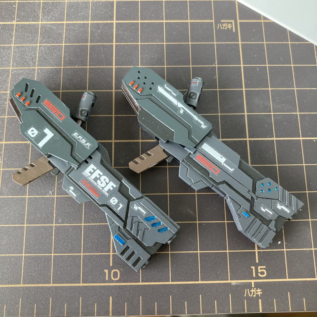 最後はジェガンの2丁ハンドガンです!プラ板で製作しました。ビームサーベルのパーツをつけられるのと、強化パックを付けたバージョンにできるのと、自分としては頑張ったなと、改めて感じます😌ある武器をモチーフとしてますw