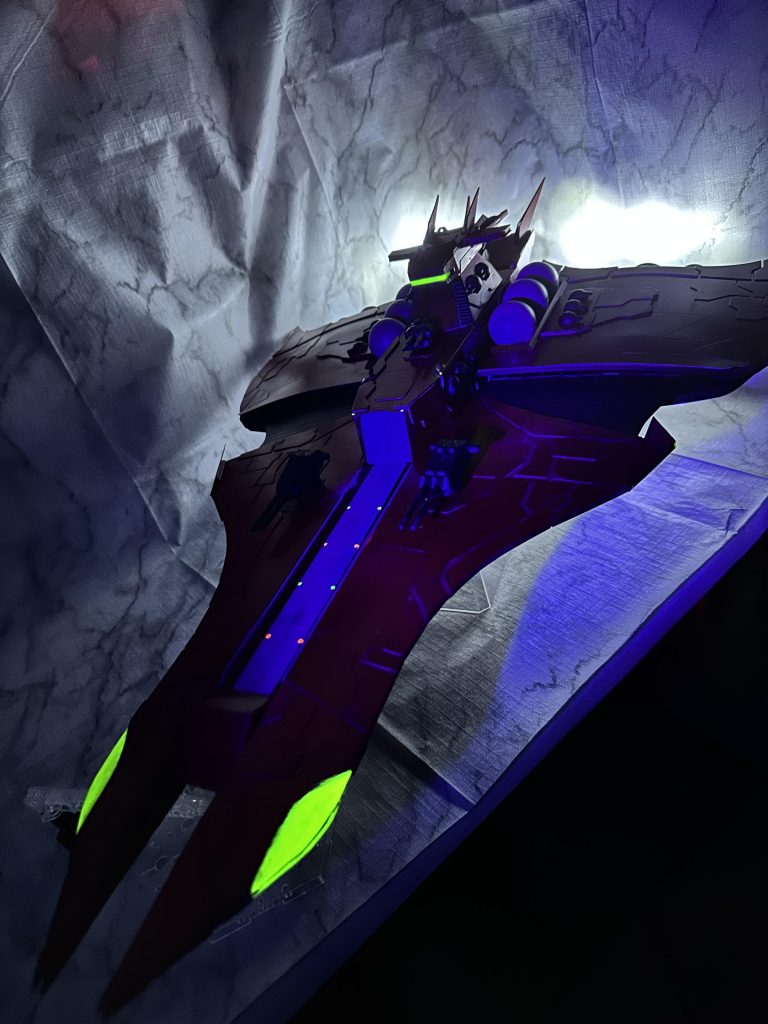 艦首の眼のようなところ、中央のカタパルト、ブリッジや機体各所の先端に蛍光塗料を塗布してあります。
