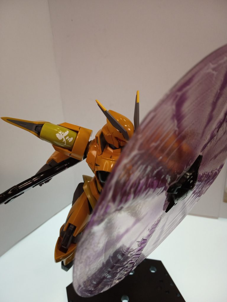 後方より。 真っ直ぐ立たせているつもりでも、歪んでるんですよね。うまく撮りたい。 グレーの関節部分等はメカサフのつや消しままです。クリアーをかけるか迷いましたが、このままでも違和感なかったので良かったです。