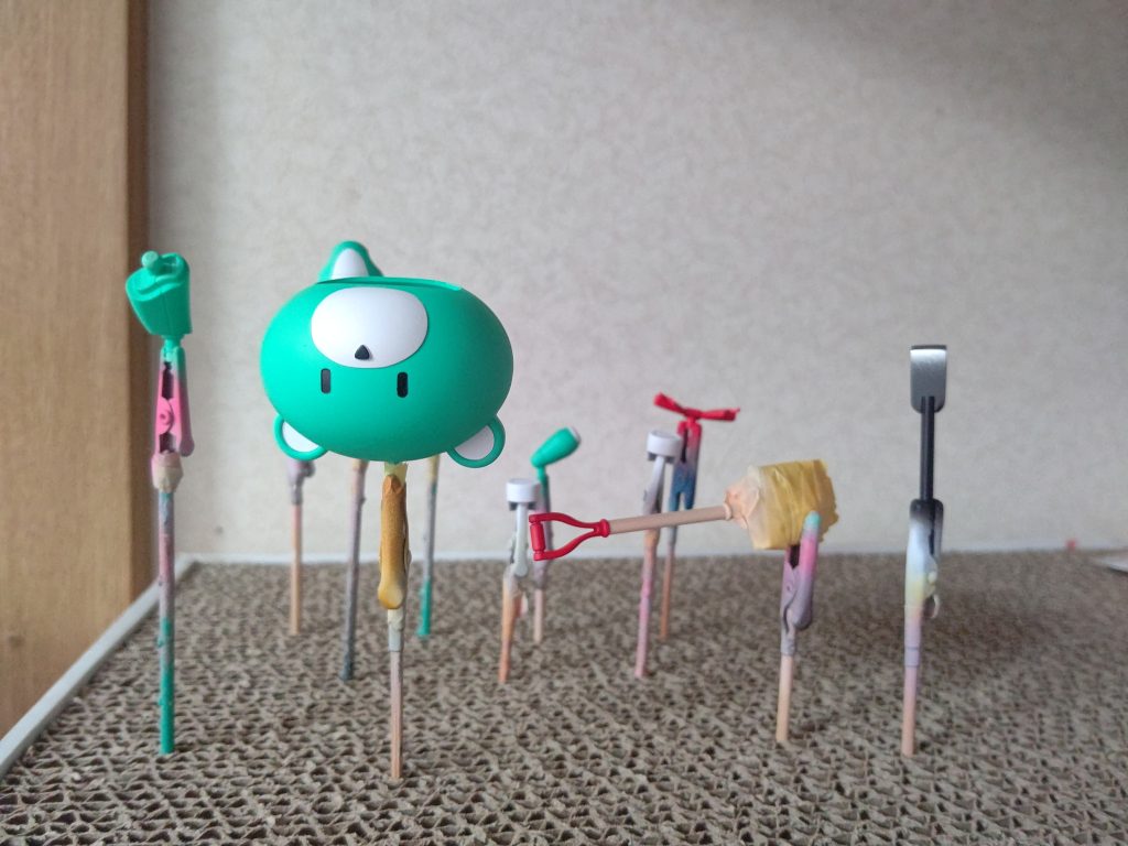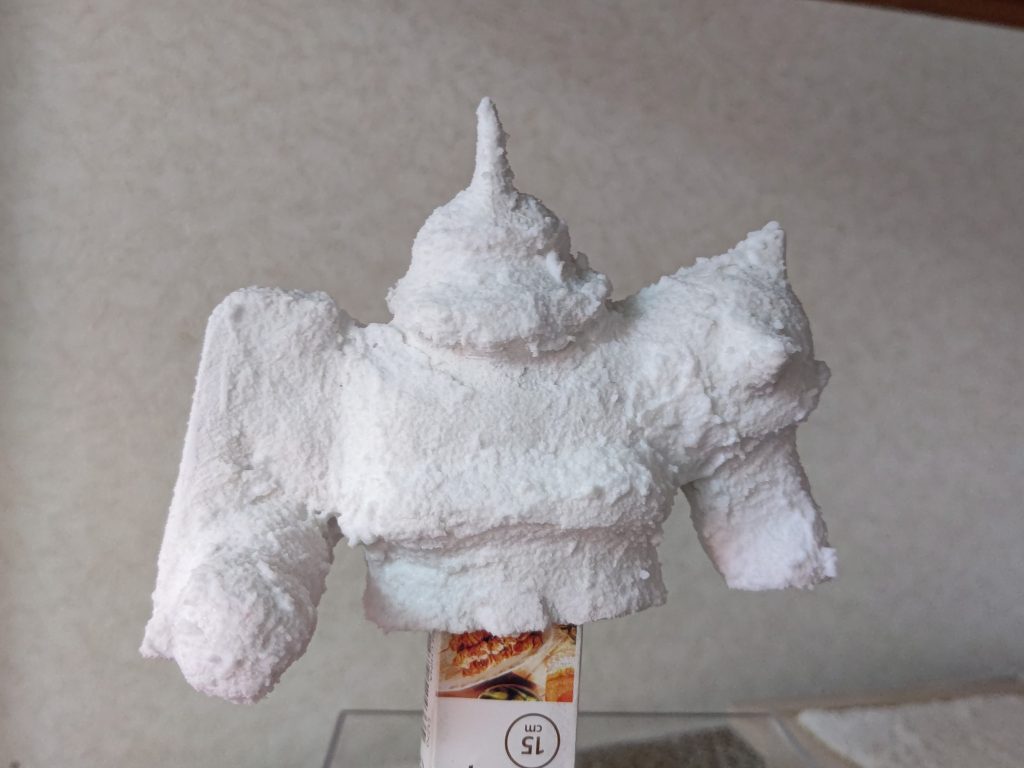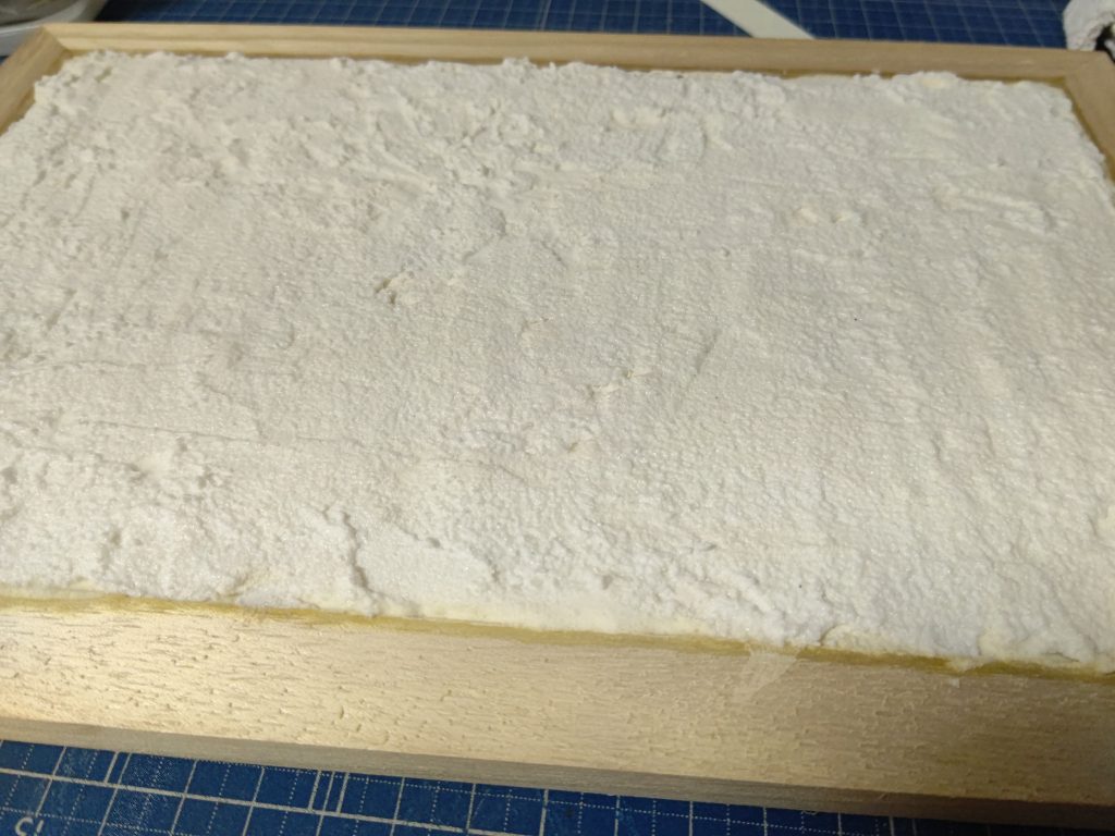 素材は、重曹を水と木工ボンドで溶いたものに、焼き塩を添加してます。それを筆やハケで塗りたくって、乾く前にヘラで少しならしました。