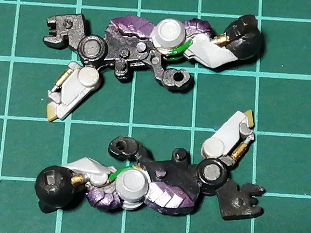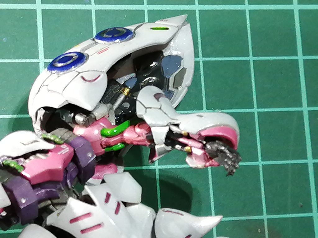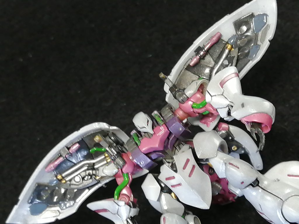 背中から、リアスカートに伸びるアームは折れるし、ビームアックス?は一本曲がるし、最後の墨入れでは塗料で筋彫りが埋まってしまったので、塗装後に筋彫りのし直しもしました・・・orz