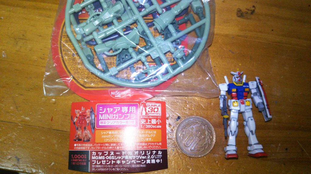 日清食品とのコラボでカップメンにガンプラが付いていた事が有りました。それがこの1/380スケールのガンプラです。ちゃんとバンダイが監修をした正式なガンプラになります。後ろは1/144EGガンダム。