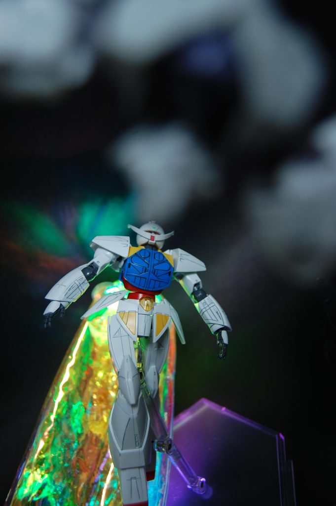 繭の糸はターンエーの方にはかけずに手前にだけ配置して、前ボケさせて元のただの糸の素材感が出ないようにしました。背景の虹色と重なってる部分なんかは特にいい感じになったと思います。プラモではなかなか再現できませんが、ターンエーの最後の表情はなんともいえない切なさがありますよね。