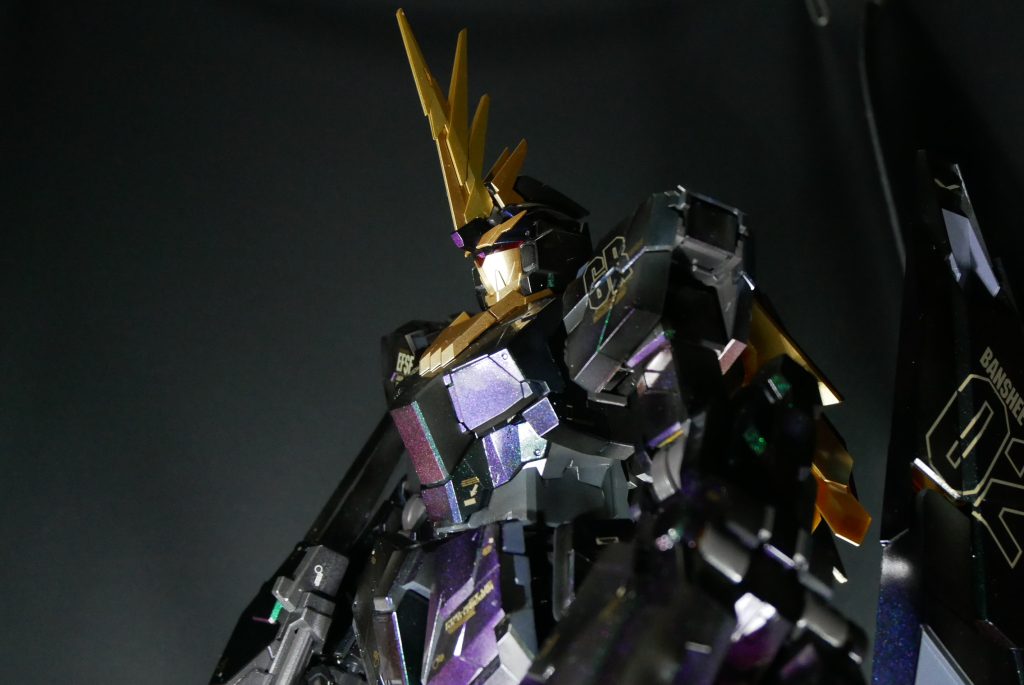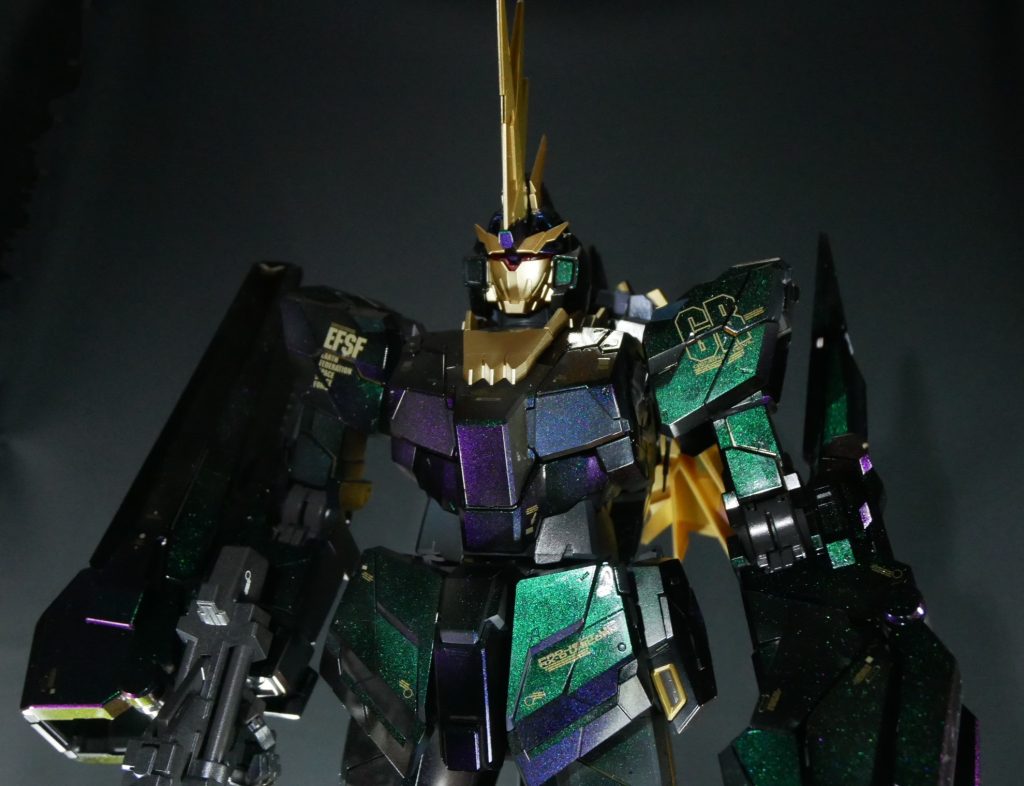 PG バンシィの塗装をどうしてもマジョーラで仕上げたくて、Show Upさんから出ているウレタン塗装/マジョーラに挑戦してみました!!ウレタン塗装をよくご存じな方は知っているでしょうが、やはり水性やラッカーとも違う性質で、特にトップコートは手こずりましたw。表面処理しようと思ったのですが、臭いもきつくてすぐ諦めました。男は黙ってランナー塗装一発勝負w。Show Upさんから出ているサーフェイサー→リアルブラック→アンドロメダ→1型トップコートー→デカール貼り→トップコート→コンパウンド・光沢艶出しワックスを使用しました。