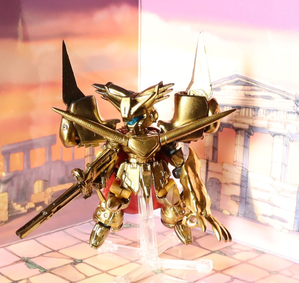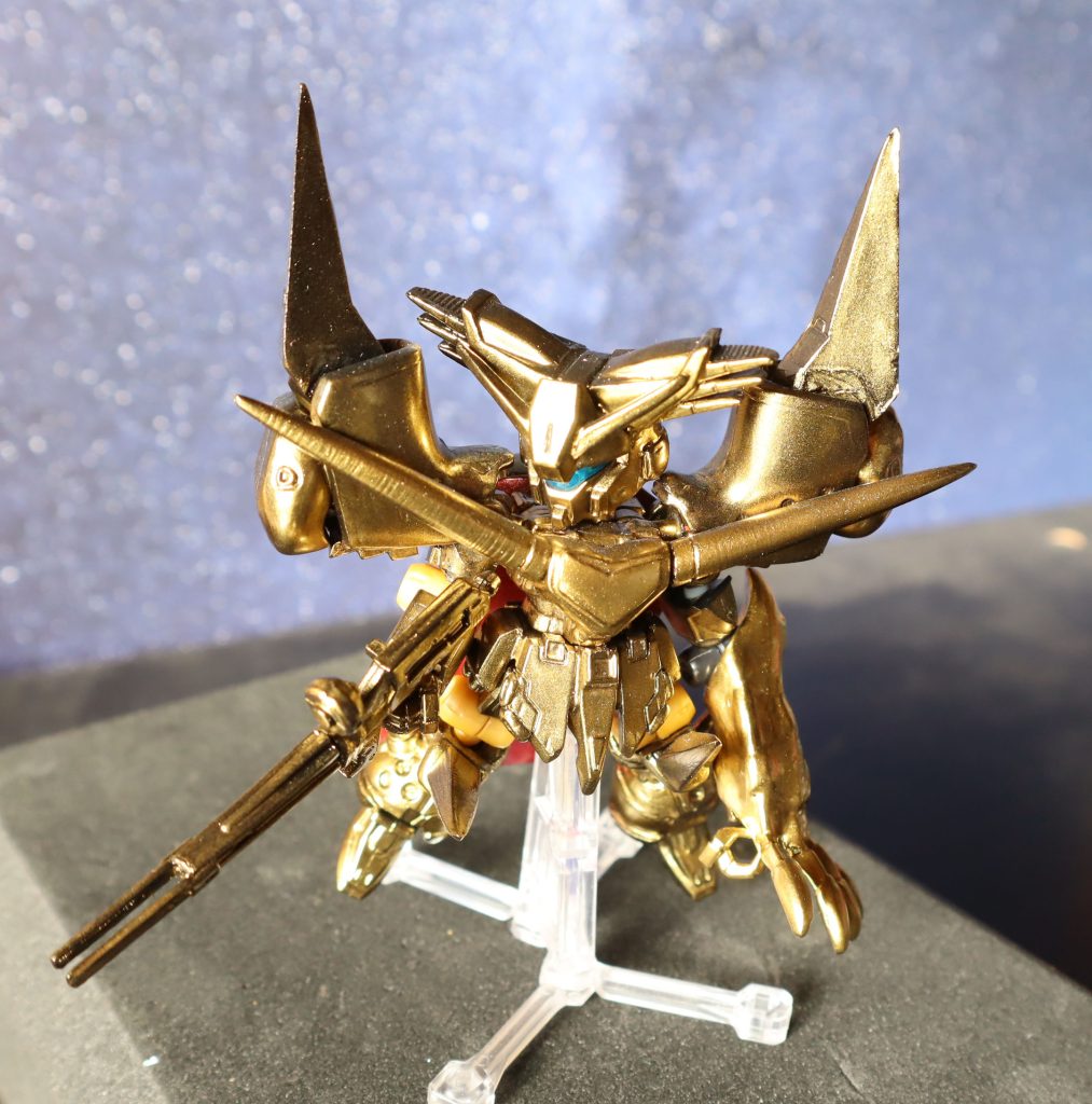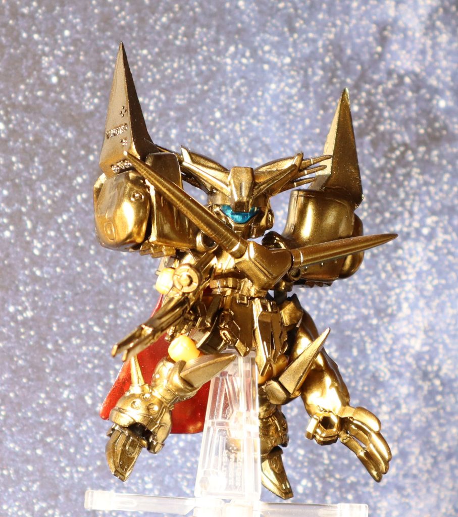 モビルスーツアンサンブルのジェガンを基礎にガシャのパーツ、プラ板、プラ棒、パテを使用してゴージャスガンダムを作成しました。