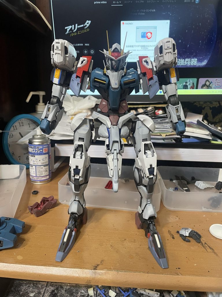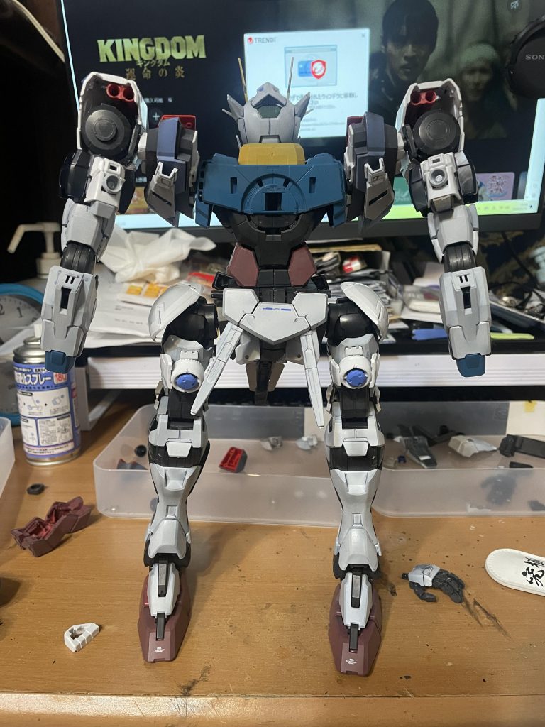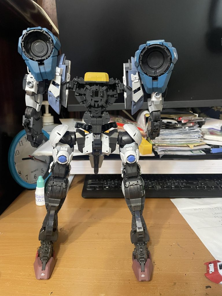 数年前に作ったダブルオーライザーをアーマードコア風に作り直しました。色はホワイトグリントをイメージしています。オーバードウェポンはオーライザーのパーツに余剰パーツを切った貼ったして作りました。武器を支えられず、背中が重くバランスはかなり悪いので、一部固定ポーズにしてあります。足首は旧MG EX-Sのものを連結し前後逆にしました。腰部もAC風にでかく長くしてあります。