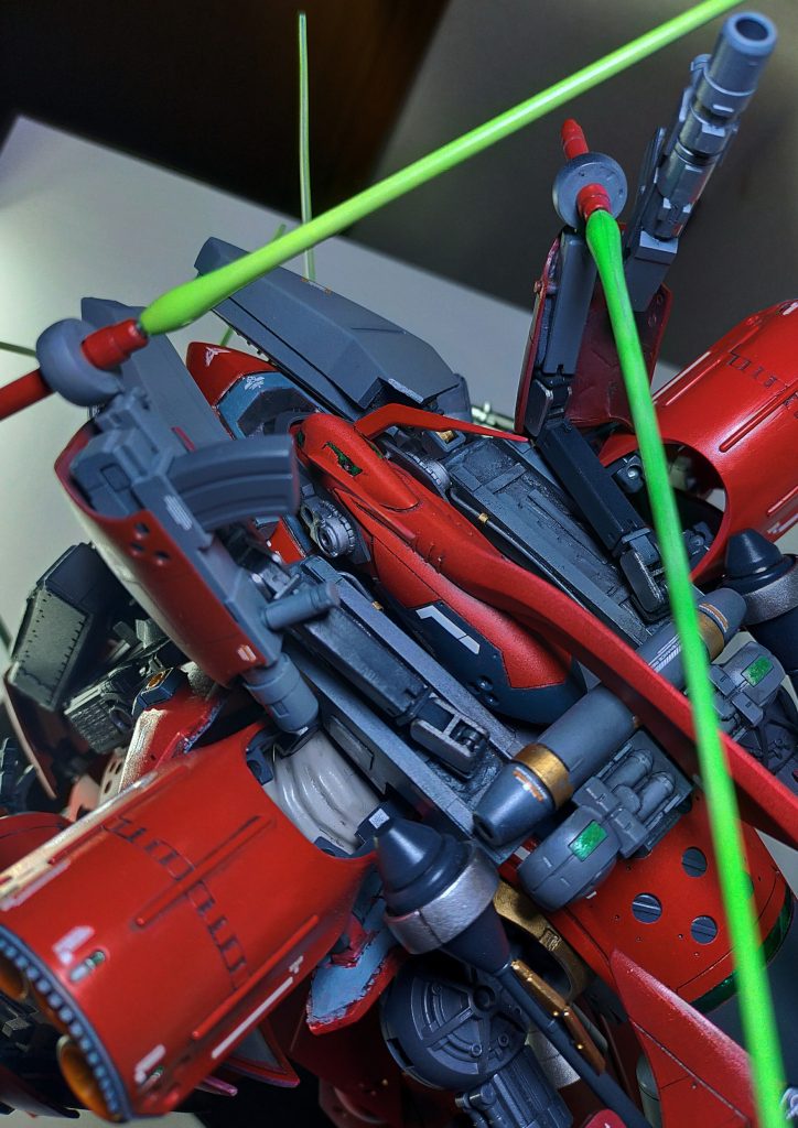 ズサやゼクツヴァイ(センチネル)のミサイルに影響されて86発ミサイルを自作、腹部にはサザビーのメガ粒子砲も移植してあり、パイプも換装してあります。