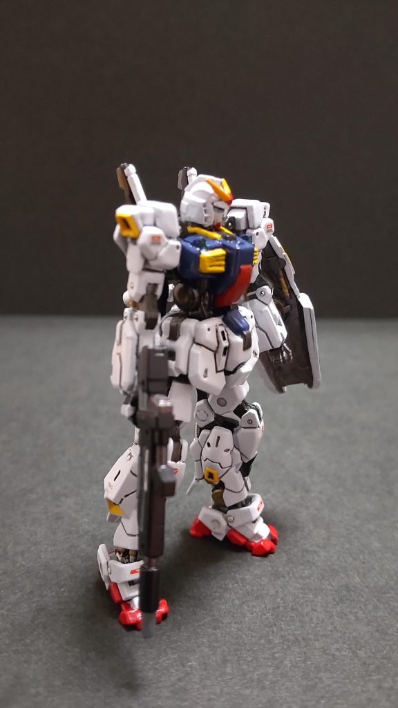 合わせ目処理、表面処理、スジ掘り。塗装は黒サフで下地処理、ベース色( ガンダムホワイト水性)細部は筆塗り。水転写式デカールで情報量の追加。最後にプライマー( 半光沢)で処理しています。