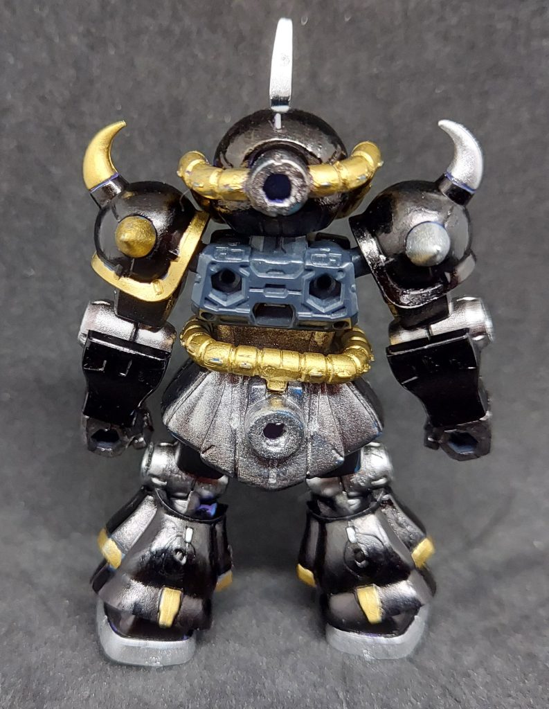 塗装前の画像撮り忘れてましたが…ジャンク扱いでまとめて購入した物の中にあった全体的に紫に塗られてる(+塗料が厚い)状態のやつで「これどうしたもんか…」って感じでした。…アルコールに浸けて金属ブラシやらで擦ってだいぶ落としても塗料残りはまだまだあったんですが、とりあえず黒くすりゃ目立たんべって考えでこうなりました。顔横のパイプの隅あたりとかにちょいちょい名残があります。配色はてきとーに考えてこうなりました。まぁまぁ満足してます。