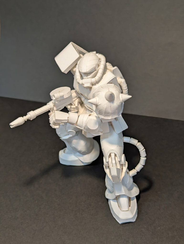 角張ってるジムならともかく、丸みをおびたザクを紙で作るとは感服です!全く隙のない造形…、初見ではいわゆる「大人の折り紙」的なものなのかと思ってしまいましたよ😅(爆)