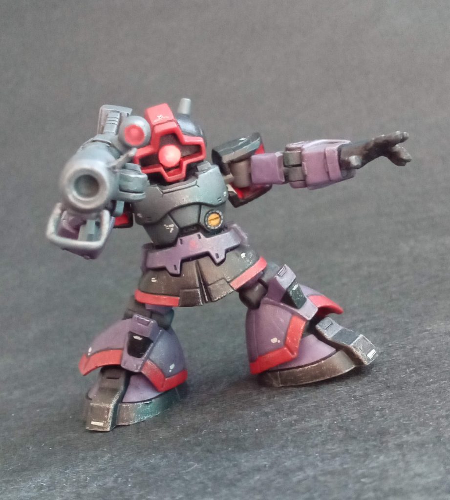 モビルスーツアンサンブルのドムを黒い三連星仕様に改修、リペイントしました。頭部の形状、モノアイの可動、胸部の増幅、二の腕の別パーツ化による可動域UP、バズーカの改修、オルテガハンマー制作が主な改修ポイントです。モノアイ、スコープはUVレジン&蛍光エナメル。塗装はシタデルでの筆塗。スミイレはウェザリングカラーでのウォッシング、シタデルのシルバーでドライブラシで仕上げてます。