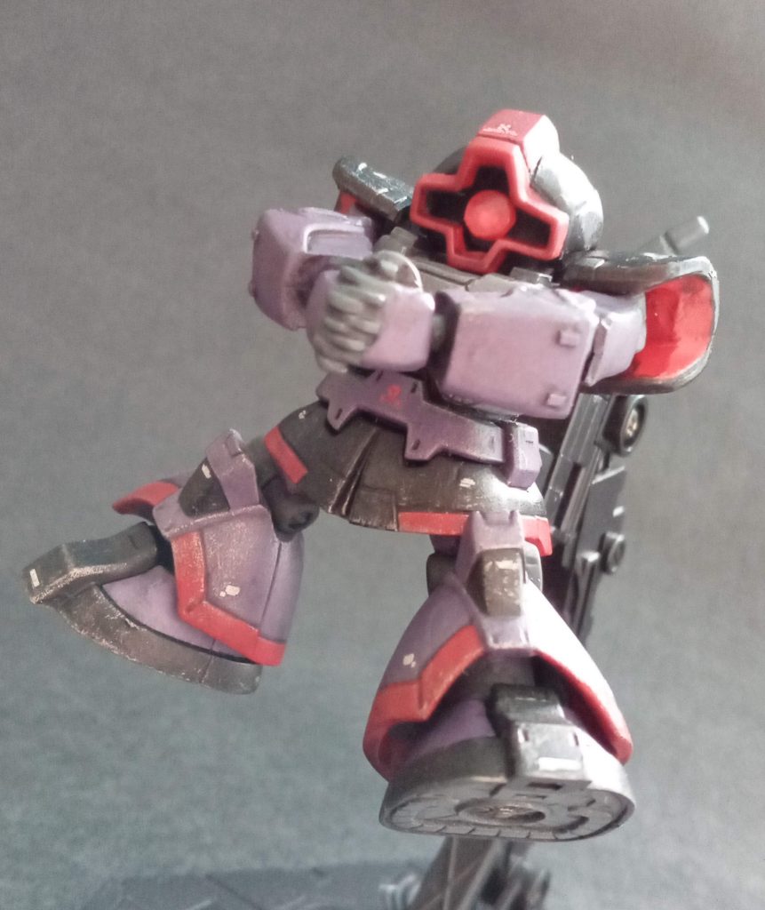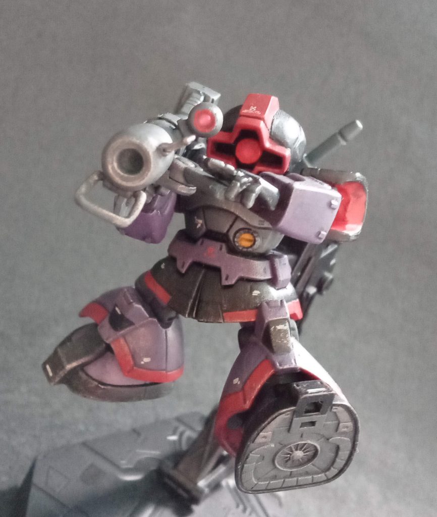 カラーリングは、大河原先生の哀戦士のポスターver.を意識して行いました。赤いラインは、ディテールの塗分けで表現。リアルタイプ的な感じを狙い、ウェザリングカラーのマルチブラックで汚し、シタデルのシルバーでドライブラシで仕上げました。いい重厚感になりましたね(>_<)