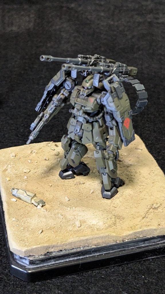本体色はオリーブドラブ。ゲパルトモチーフなのでこれ一択でした。関節&フレームはサフそのまま。キャタピラに当たるつま先はメタリックブラックを塗るつもりでしたが手元になく、買いに行けなかったのでガンダムカラーの連邦グレー(メタリック)で塗りました。