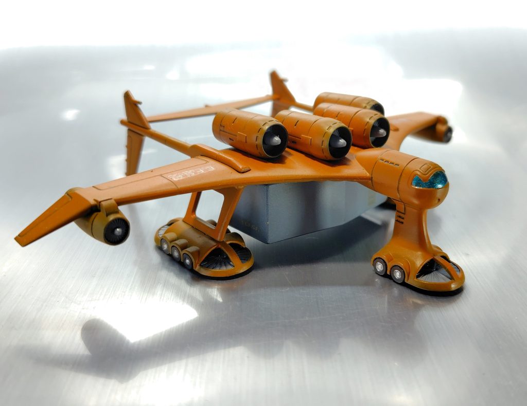背中のエンジン4機の位置を横一列から左右と中2個をチョイずらし。尾翼の下つなぎを上に変更。水平尾翼になるのかな?コンテナの搬入出の際邪魔で出し入れできないとおもうんですよね。実際に搬入出の仕組みは検討されなかったんですかねぇ。。。コンテナの開閉入れましたが輸送機に装着状態では上開きしか出来ないけどこれも現実味は薄いかなぁ。