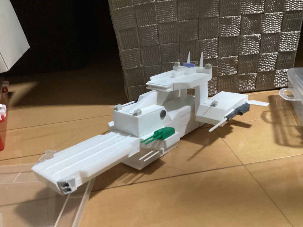 上部のメガ粒子砲は以前のマゼランの余り物、下部は自作です。なので形に違いがありますね。側面に付いているのは長距離ビーム砲と言う設定です。機銃は戦艦のプラモデルに武器のみが売っていたのでそのまま流用。