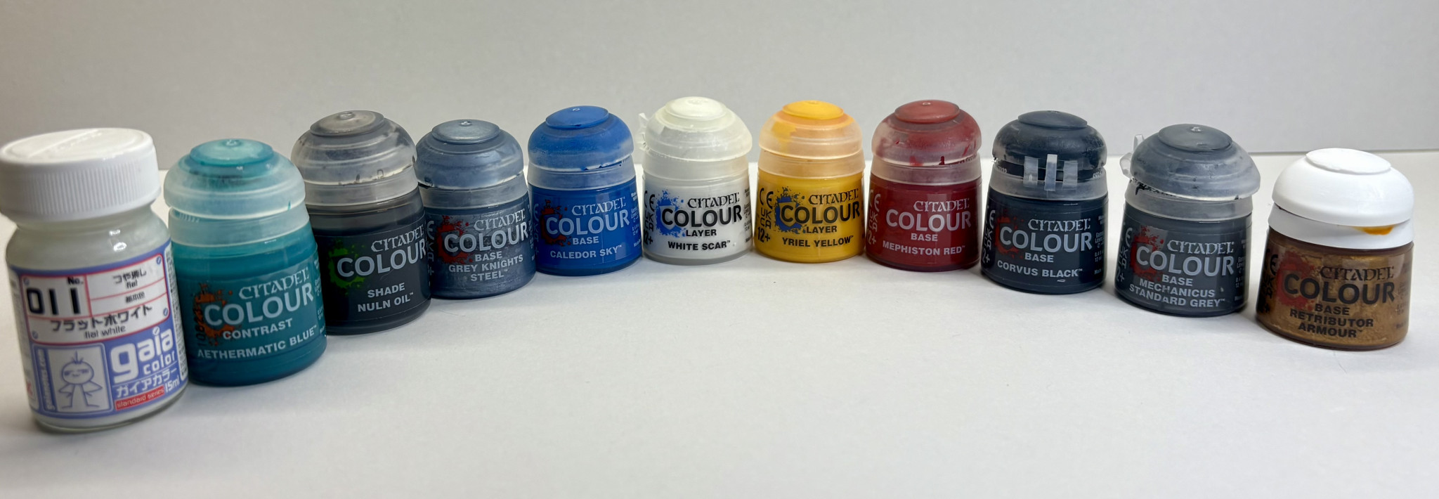 ABS素材なのでプライマーを吹いた後、ベースのホワイトにはラッカー系艶消し白(ガイアノーツのフラットホワイト)をエアブラシで塗装。他の色はシタデルカラーで筆塗りしました。仕上げは艶消しクリア(ガイアノーツの艶消しクリア)をエアブラシで吹きました。