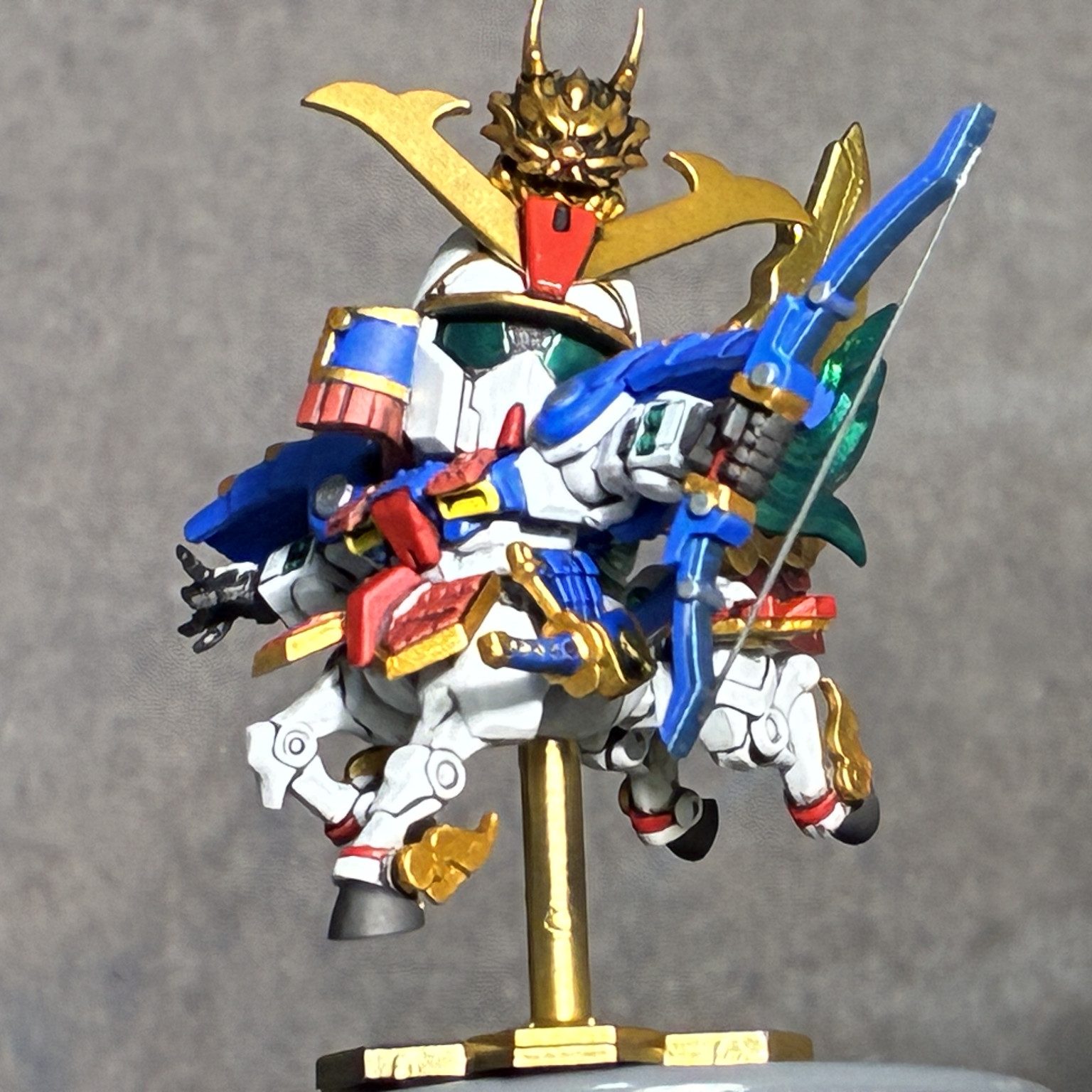 ガンダムスペリオールディファインより第二作目完成と致します☺️顔面側部より後頭部にかけて、胸部、ふんどし部分の赤ですが、オデコやコックピット部をモンザレッドにしたのですが、その赤だと浮く気がして、その部分をRLM23レッドのちょっと甲冑っぽく抑えた感じの赤にしてみましたがいかがでしょうか😅弓の弦は、ちょっと太くなってしまったのですが、エレキギターの新品の弦の先端を取っておいたのでそれを単に切って貼っただけの『お手軽弦』として再現してみました。まぁ模型的ディフォルメとゆーことでご勘弁を😅次は…ウーンドウォートかなぁ…ハイゴッグかなぁ…😅ウイングは最後にしたいと思っています☺️