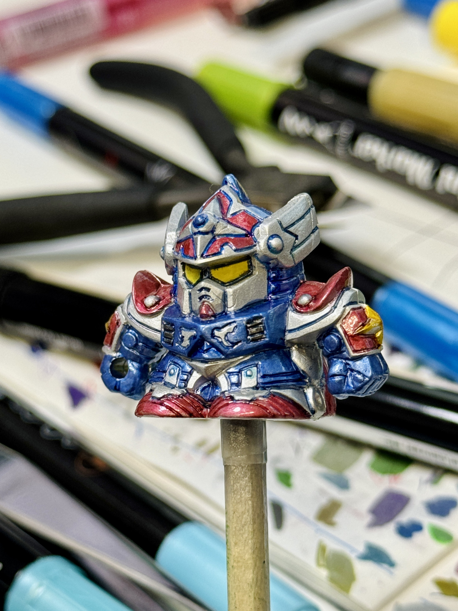 @heruheru… その他 2025.10/04更新 ガン消し 皇騎士ガンダム 48 37 いいねしたモデラー(37) 0 0 作品を共有 ガン消し版 皇騎士ガンダムの塗装です。装飾が細かくカッコいいですね! この頃のガン消しは非常にバランスの良い体型をしていますノーマル、Gアーマー、フルアーマーの3ショット!ガン消しにセリアのシルバーマーカーをガンダムマーカーエアブラシでいきなり吹きかけます。私は下処理無しでいきなり吹きますが、このマーカーなら特にベタつきはしませんその上に、アクリルマーカー筆ペンで書き込んでいきます全体を塗ったら、一度ダイソーのラッカースプレークリアを吹きかけ、硬化させます。この上からなら、墨入れはHI-TEC-Cの0.3mmで書き込めます。 みんな大好き円卓の騎士、皇騎士ガンダムです👑 コメント コメントをして応援しよう コメントにはログインが必要です @heruheru3 SDガンダム系(BB戦士、ガン消し、SDCSを)を中心に作っています。 ガンダムマーカーエアブラシシステムに使える様々なペンを模索しています。 100均系アイテムを活用することが多いです。 @heruheru3さんがお薦めする作品 Gジェネレーション No.42 ドム ガン消し 皇騎士ガンダム 9 Gジェネレーション No.42 ドム Gジェネレーション No.42 ドムです。 SD体型のバラン… @heruheru…さんのページ この作品をお薦め作品に設定する Please login to update your profile! Please login to update your profile! Please login to update your profile! Please login to update your profile!