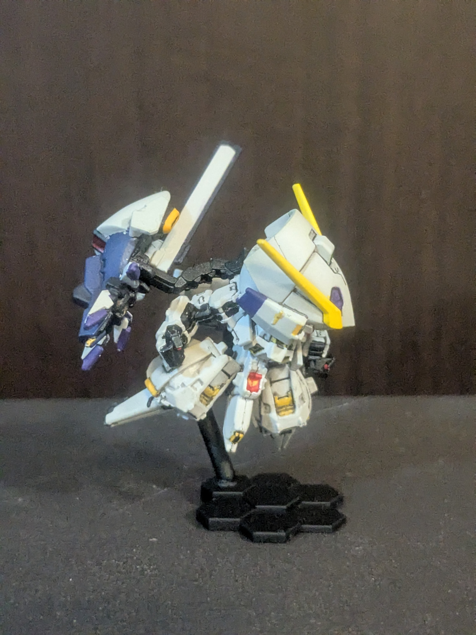 ベースは白サフ後に灰色9号。紺はティターンズブルー2、アンテナはポスカの黄色、紫もポスカ、後はファレホとラッカーで筆塗りです。