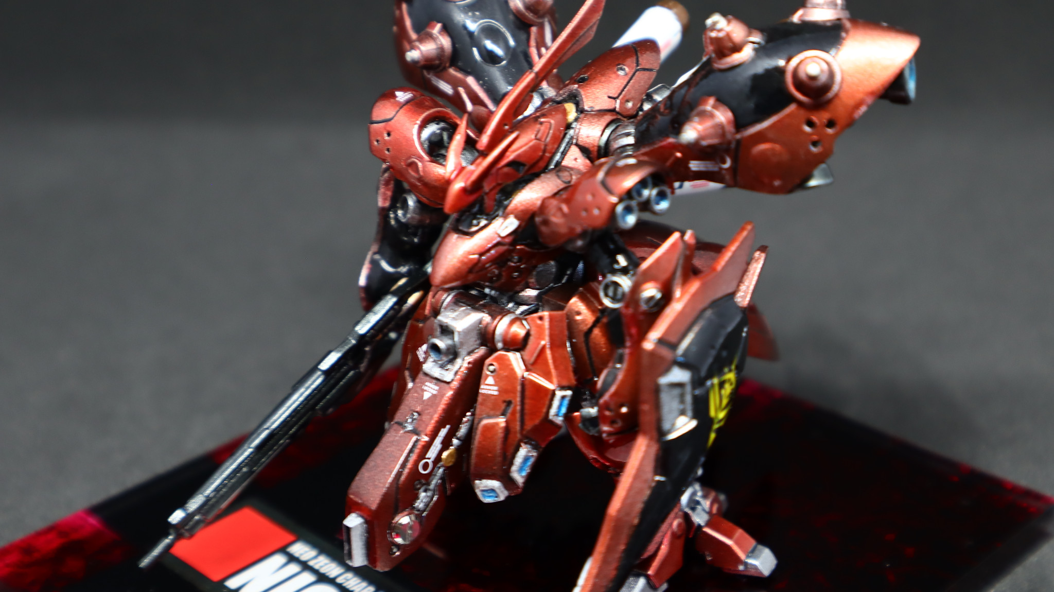 台座は100均のアクリル板で自作。転写シールでロゴをアクリル板の裏から貼って、ロゴの裏から白サフ→クールホワイト厚塗り、クリア→クリアレッド→ラップにシルバー吹いてポンポン→ブラック。いわゆるラップ塗装の逆塗装工程です。