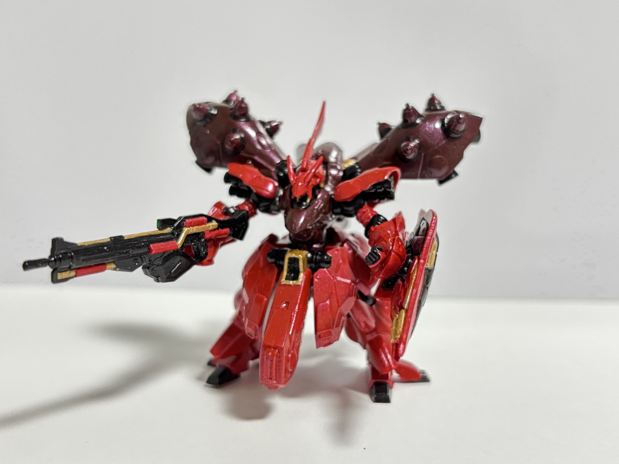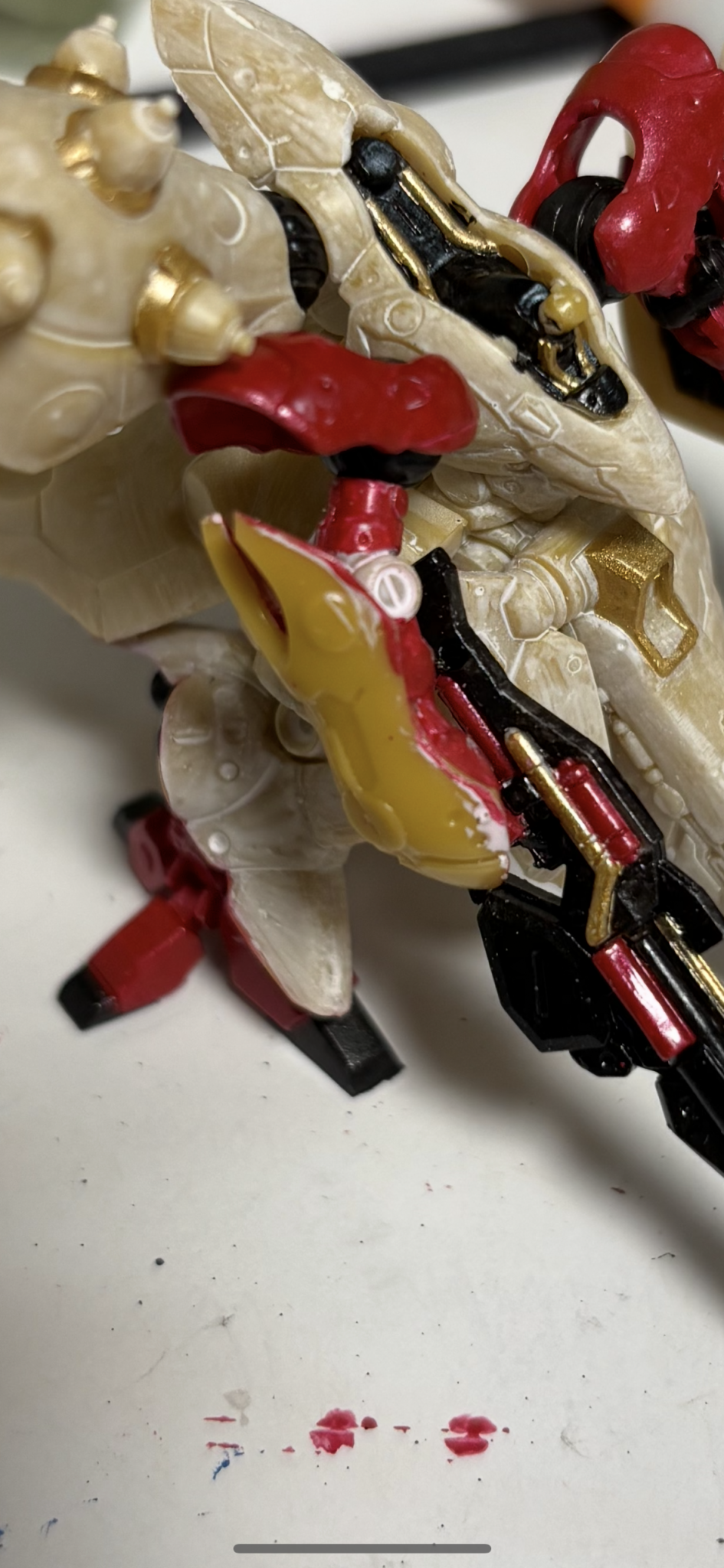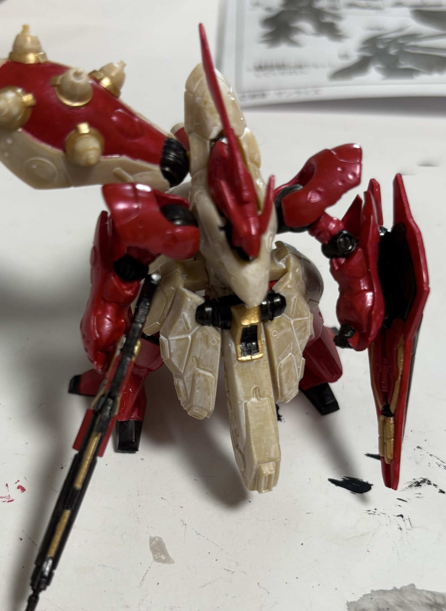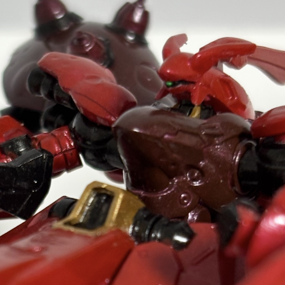 ざっくり赤い彗星パターンで胸とスカートは濃い赤、ファンネルラックはどうしよう…って感じで塗り始めました
