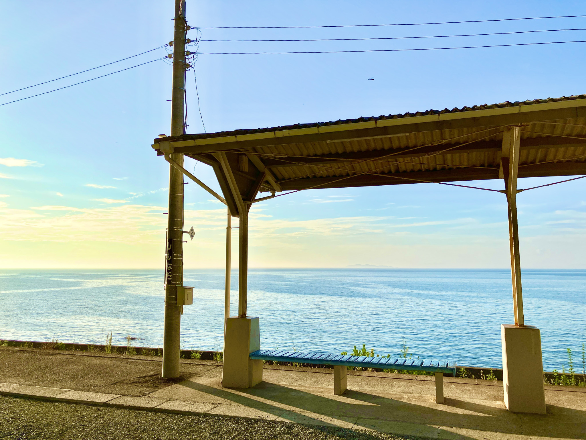 この海辺のベンチのカットは愛媛県伊予市・JR予讃線『下灘駅』です。
