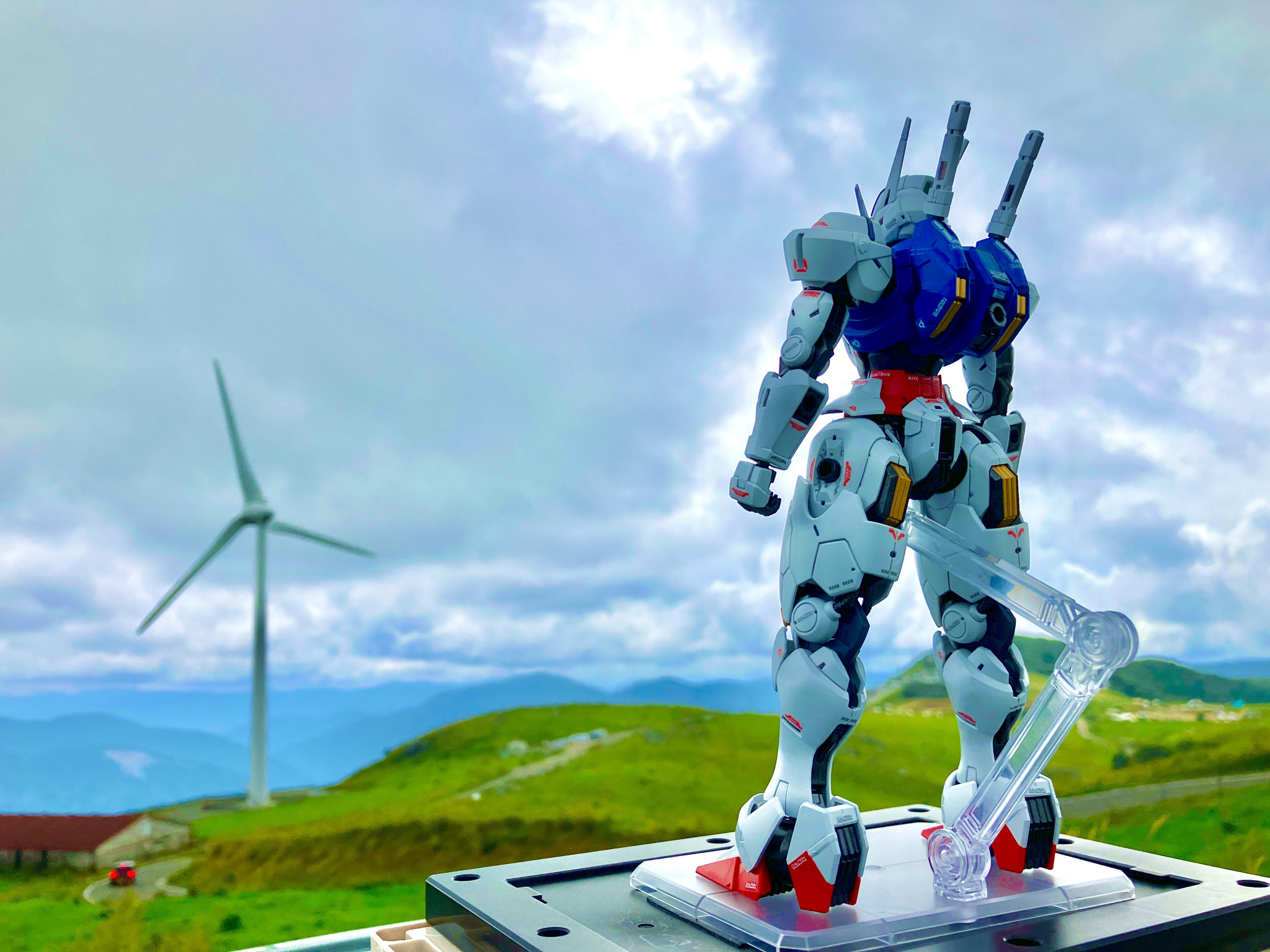 ちなみに今回はパノラマ景色や風車とのサイズ感を出す為にいつものHGではなく、フルメカニクスのエアリアルの方を買ってきて作って持参しました。