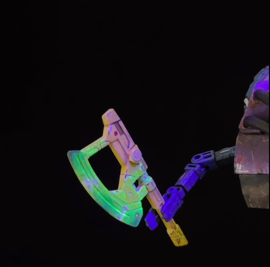 glowing axe using UV reactive paint. Although in hindsight I would have not used white paint on top of the UV Green, as it blocks the light from shining through.