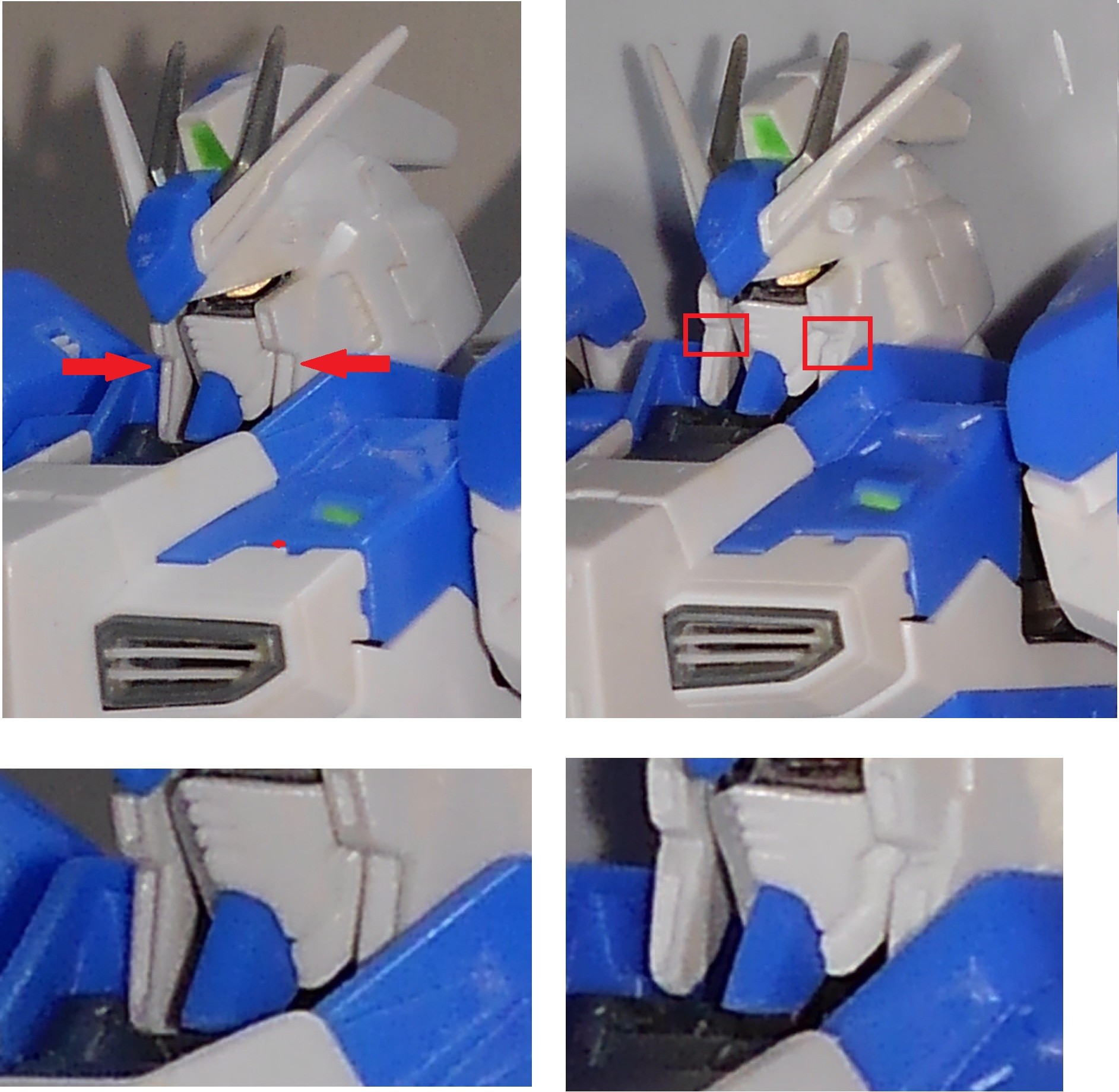 作成中のHGハイニューです。見づらいかもですが、赤矢印の部分に切り込みを入れ、ランナーパテで造形しました。右側が造形後ですね。こういうちょっとだけ盛りたい時に私はよく使います。