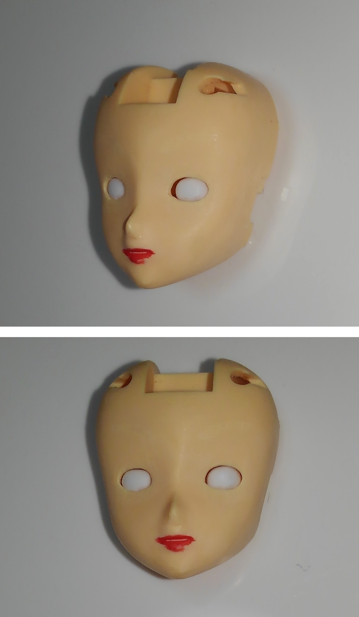 ダメなところですが目パーツと顔パーツのサイズが全くフィットしていないのです。これが逆に良い感じに見えなくもないのですが、目元に隙間があるのはおかしいので修正します。一番右はやすって全部削り落とした状態です。
